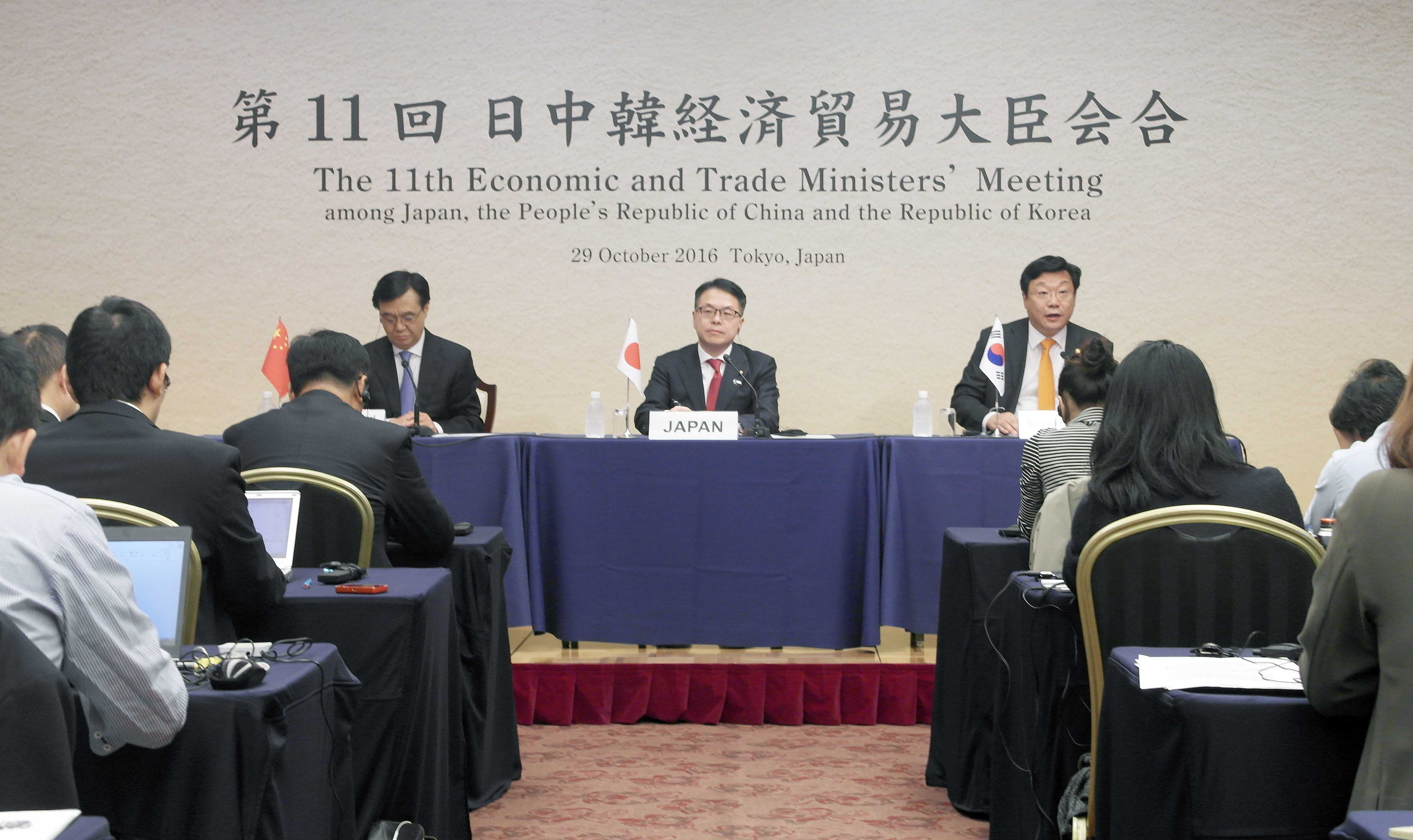 Trade, Industry and Energy Minister Joo Hyunghwan (right) joined the 11th trilateral economic and trade ministers' meeting with Japan's Economy, Trade and Industry Minister Sekou Hiroshige (center) and China's Commerce Minister Gao Hucheng (left) in Tokyo on Oct 29 . The meeting was designed to further enhance the economic and trade relations between the three countries. The ministers reached a consensus to discourage all forms of the growing protectionism across the g date2016-11-01