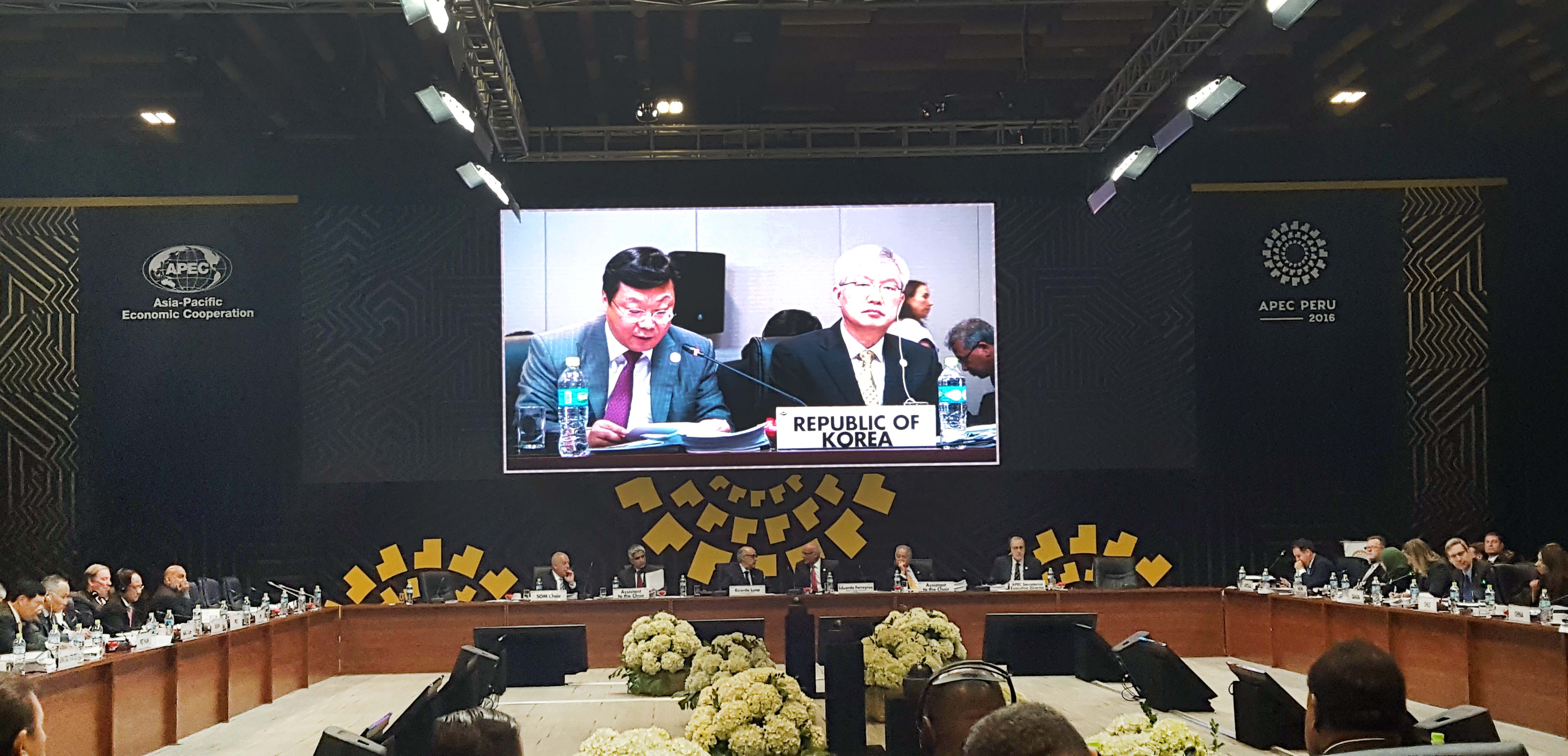 Trade, Industry and Energy Minister Joo Hyunghwan (left on the screen) and Deputy Foreign Minister for Economic Affairs Lee Tae-ho (right on the screen) attended the 28th Asia-Pacific Economic Cooperation Ministerial Meeting (AMM) in Lima, Peru, from Nov 17 to 18, hosted by two Peruvian Ministers-Minister of Foreign Affairs Ricardo Luna and Minister of Foreign Trade and Tourism Minister Eduardo Ferreyros. In the presence of 21 APEC member countries' ministers and vice ministers, date2016-11-24