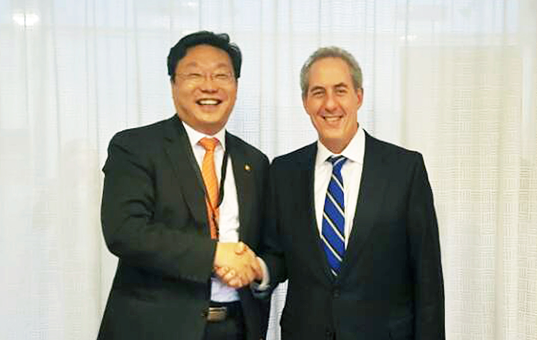 Trade, Industry and Energy Minister Joo Hyunhwan (left) met with United State Trade Representative Micheal Froman on Oct 21 during the WTO Ministerial Conference, held in Oslo, Norway, to discuss current trade issues . One of major agendas on the table was tighter trade environment against Korean steel goods in the U.S. At the talks, Minister Joo raised concerns over the recent U.S. decision to impose anti-dumping duties on Korea-made steel products and aske date2016-10-26