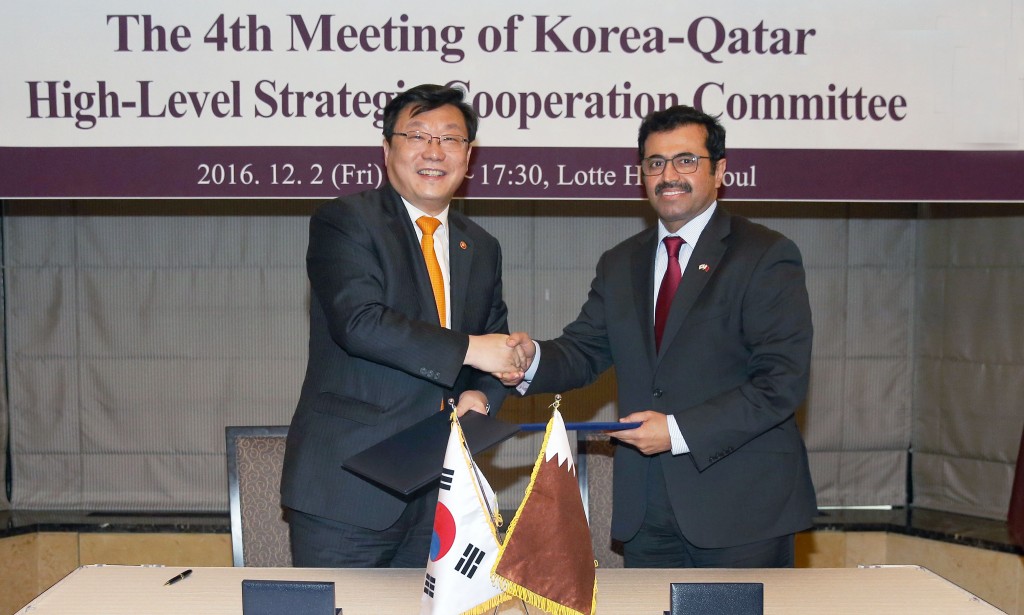 Minister of Trade, Industry and Energy Joo Hyunghwan (left) co-chaired the fourth High-Level Strategic Cooperation Committee meeting with his Qatar counterpart, Minister of Energy and Industry Dr. Mohammed bin Saleh al-Sada (right), in Seoul on December 2.The meeting was attended by government representatives from both Korean and Qatar side and the committee discussed ways of enhancing co-operation between the two countries across various fields including trade, investment, energy, infrastructur date2016-12-03
