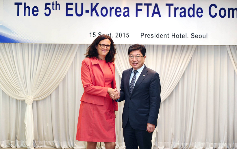 The Republic of Korea and the European Union (EU) held the Fifth Trade Committee meeting in Seoul today to check the implementation of their bilateral free trade agreement over the past five years. Minister of Trade, Industry and Energy Yoon Sang-jick met with European Trade Commissioner Cecilia Malmström before leading their delegations at the committee meeting. During their meeting, they exchanged views on various trade issues between Korea and the EU, such as technical barriers to trade (TBT), sanitary and phytosanitary (SPS) and intellectual property (IP). date2015-09-15