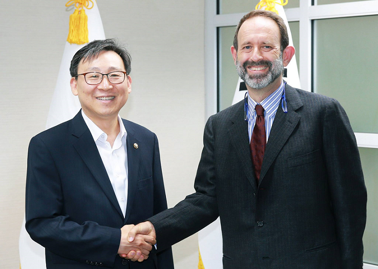 Moon Jae-do, the second vice minister of the Ministry of Trade, Industry and Energy (MOTIE), greeted a visit by Marco Della Seta, Italy's new ambassador to South Korea, in Seoul this week. During the meeting held at the Foreign Ministry, the two exchanged various views on how to promote industrial and economic cooperation between their countries. date2015-09-04