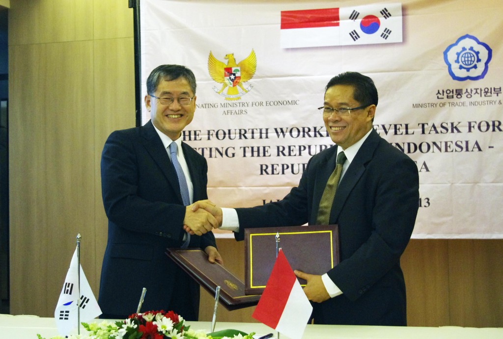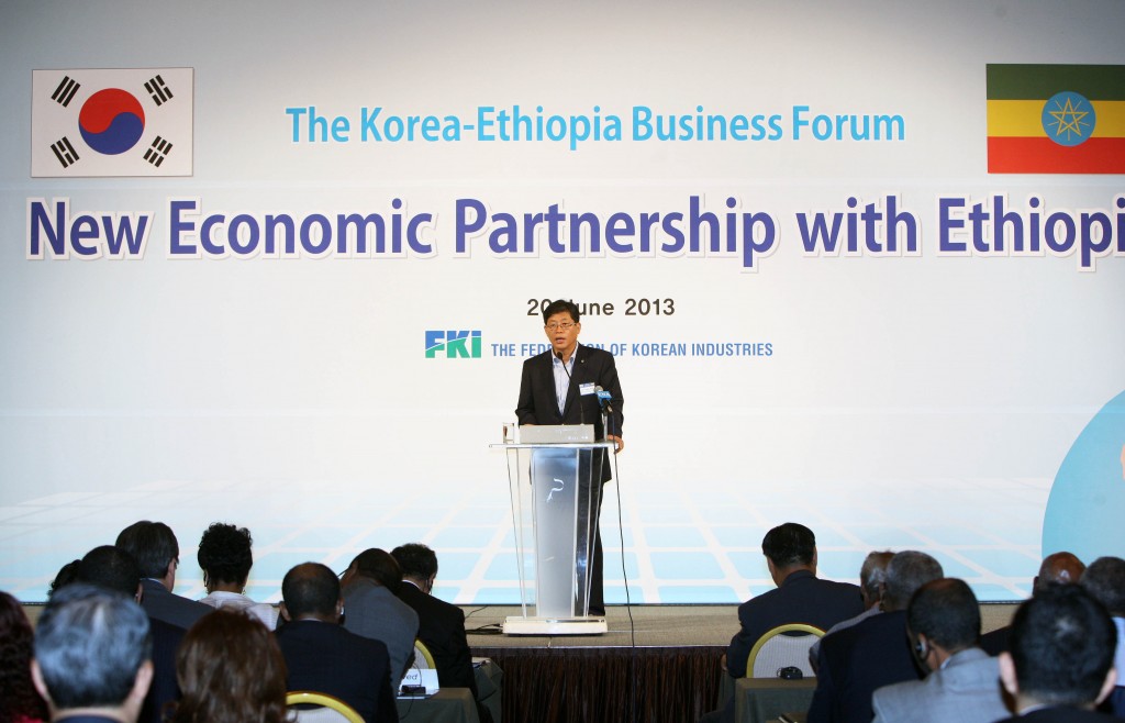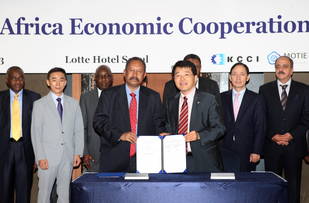Vice Minister for Trade and Energy Han Jinhyun and Deputy Executive Secretary of the United Nations Economic Commission for Africa (UNECA) Abdalla Hamdok stand together after signing a memorandum of understanding on advancing Africa’s industrial development and infrastructure on June 25 in Seoul. The memorandum was signed following the “Korea-Africa Economic Cooperation Forum,” which drew 100 participants including business leaders and ambassadors from a number of African countries. date2013-07-02