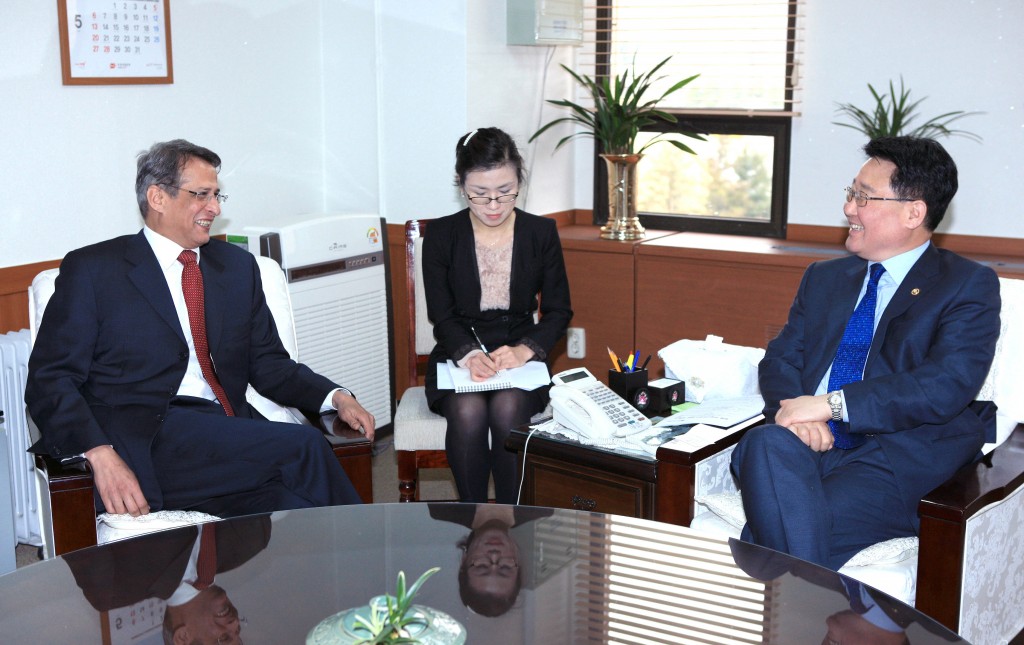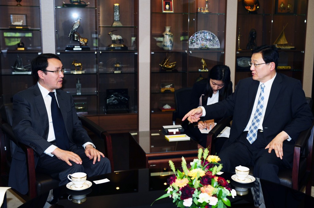 Minister Greets Kazakhstani Ambassador Minister of Knowledge Economy Sukwoo HONG speaks with Kazakhstani Ambassador Dulat Bakishev on May 3 in Gwacheon. The two officials exchanged views on trade, investment and industrial cooperation. date2012-05-04
