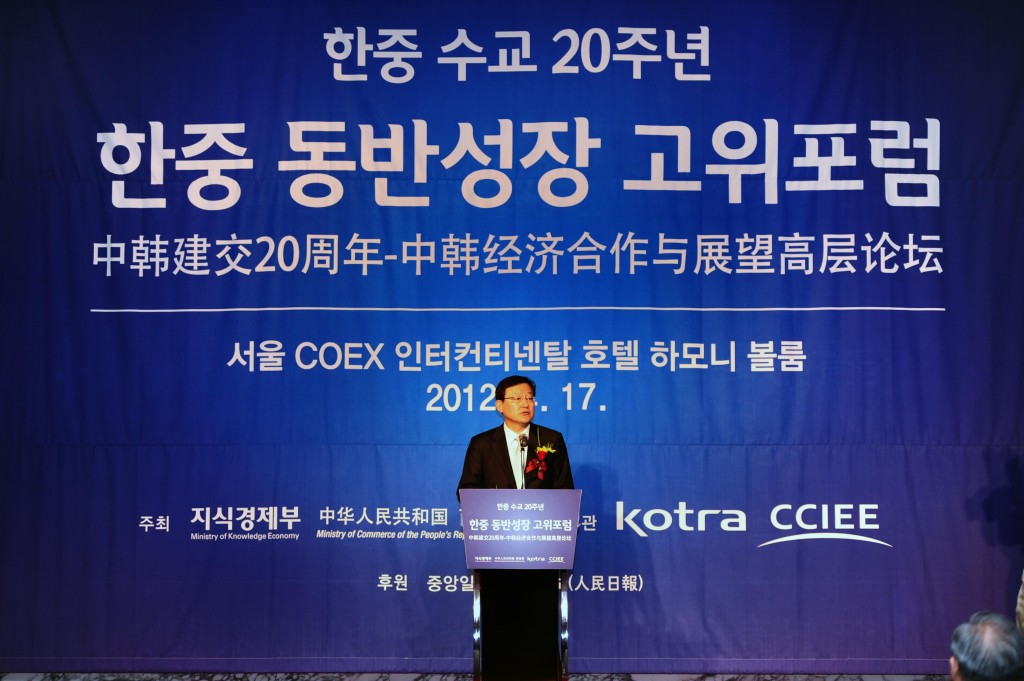 Minister of Knowledge Economy Sukwoo HONG addresses Chinese experts in Seoul on April 17 at a forum to discuss the future direction of industrial cooperation between Korea and China and celebrate the 20th anniversary of diplomatic ties. The forum drew approximately 550 business leaders and economists, as well as Chinese Ambassador Zhang Xinsen and Chairman Zeng Peiyan of the China Center for International Economic Exchanges (CCIEE). date2012-04-26