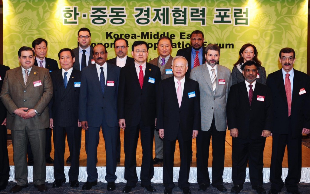 Minister of Knowledge Economy Sukwoo HONG stands with the ambassadors of 10 Middle Eastern countries and some Korean business leaders on March 29 in Seoul. The group gathered at the Lotte Hotel for the Korea-Middle East Economic Cooperation Forum. date2012-04-13