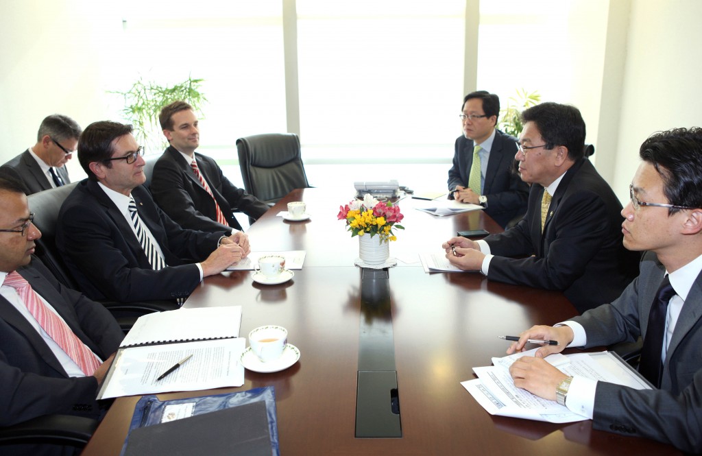 Vice Minister Meets With Australian Climate Minister Vice Minister for Industry and Technology Yoon Sang-Jick meets with Australian Minister for Climate Change and Energy Efficiency Greg Combet on April 27 in Seoul. The two officials discussed how to reduce greenhouse gas emissions and strengthen industrial cooperation. date2012-05-04