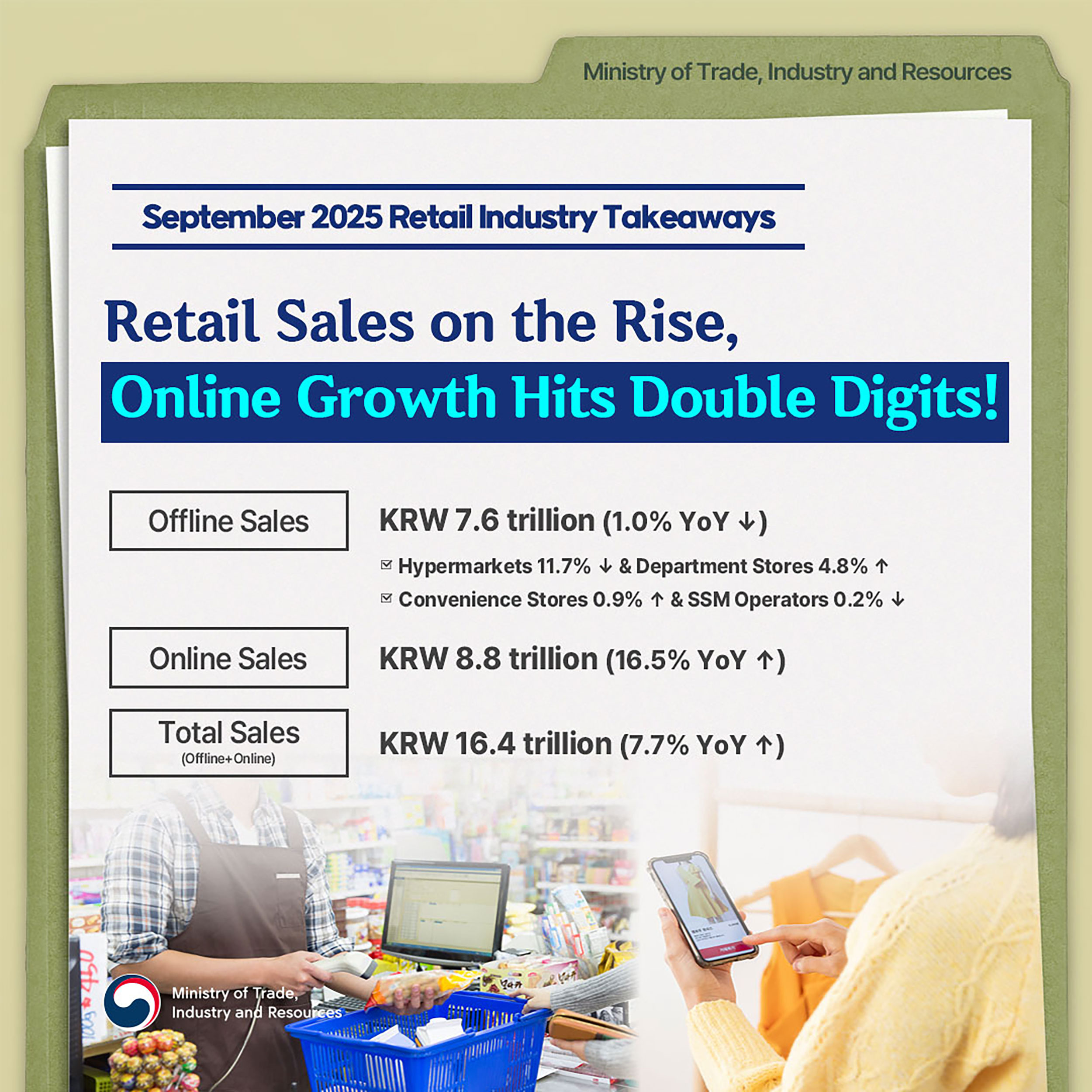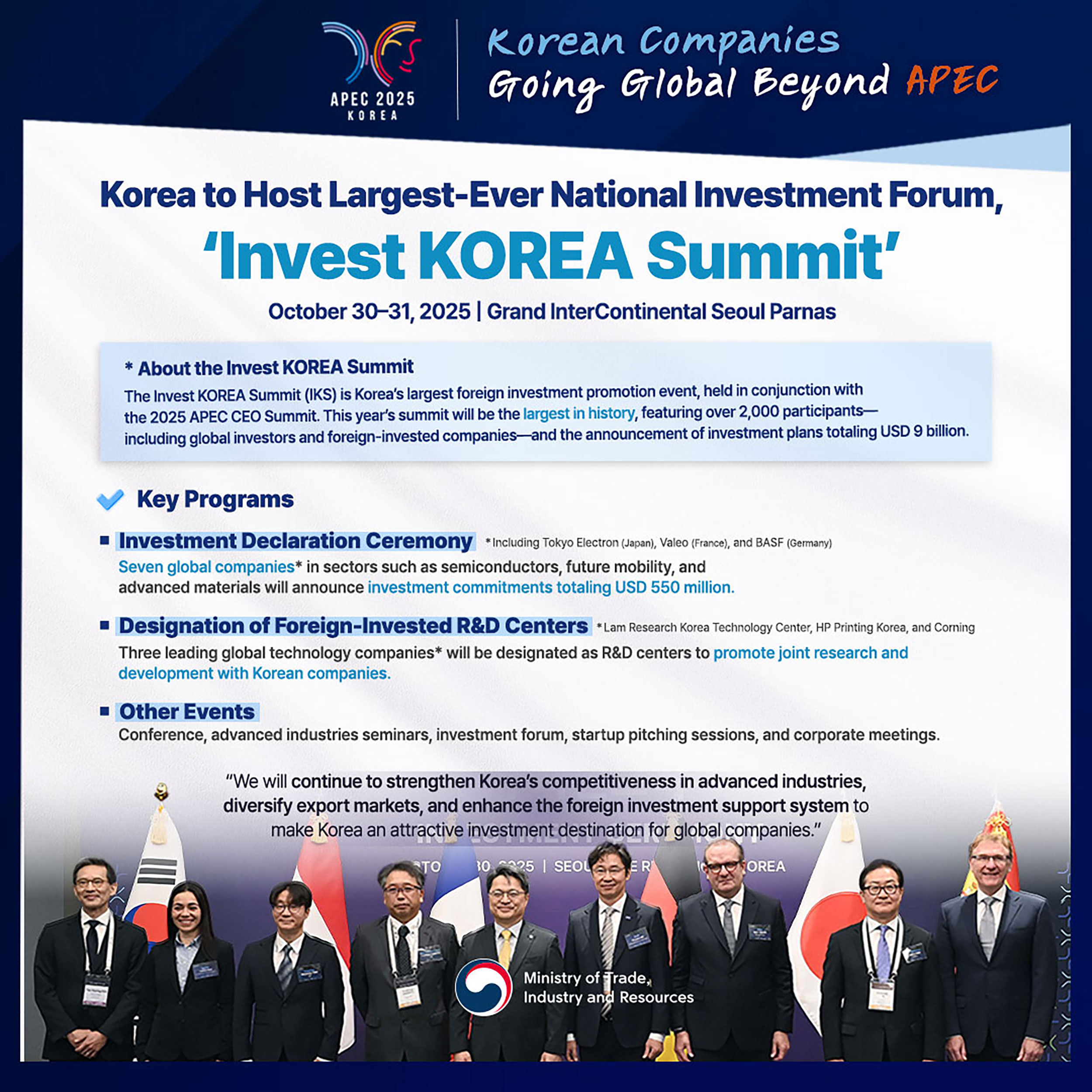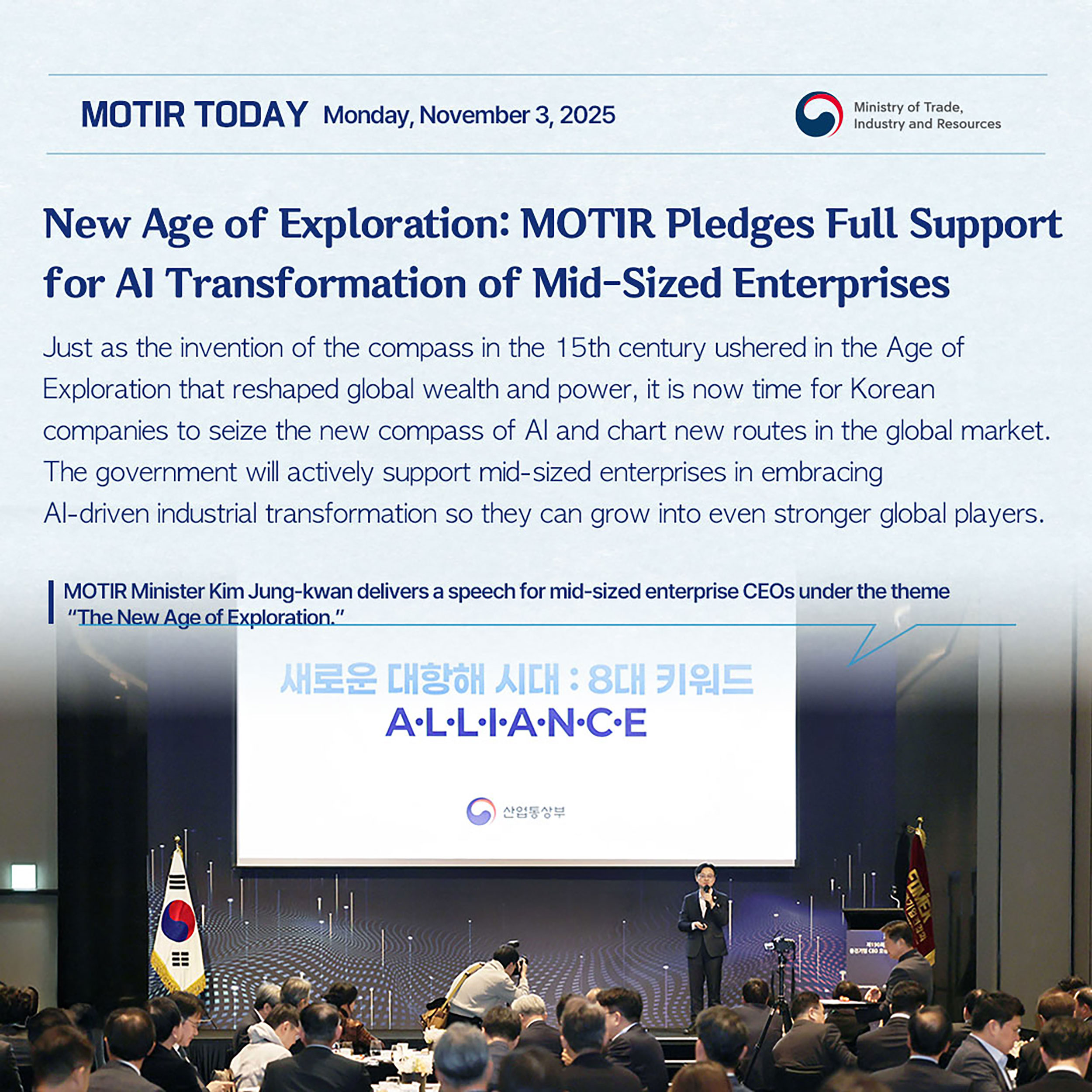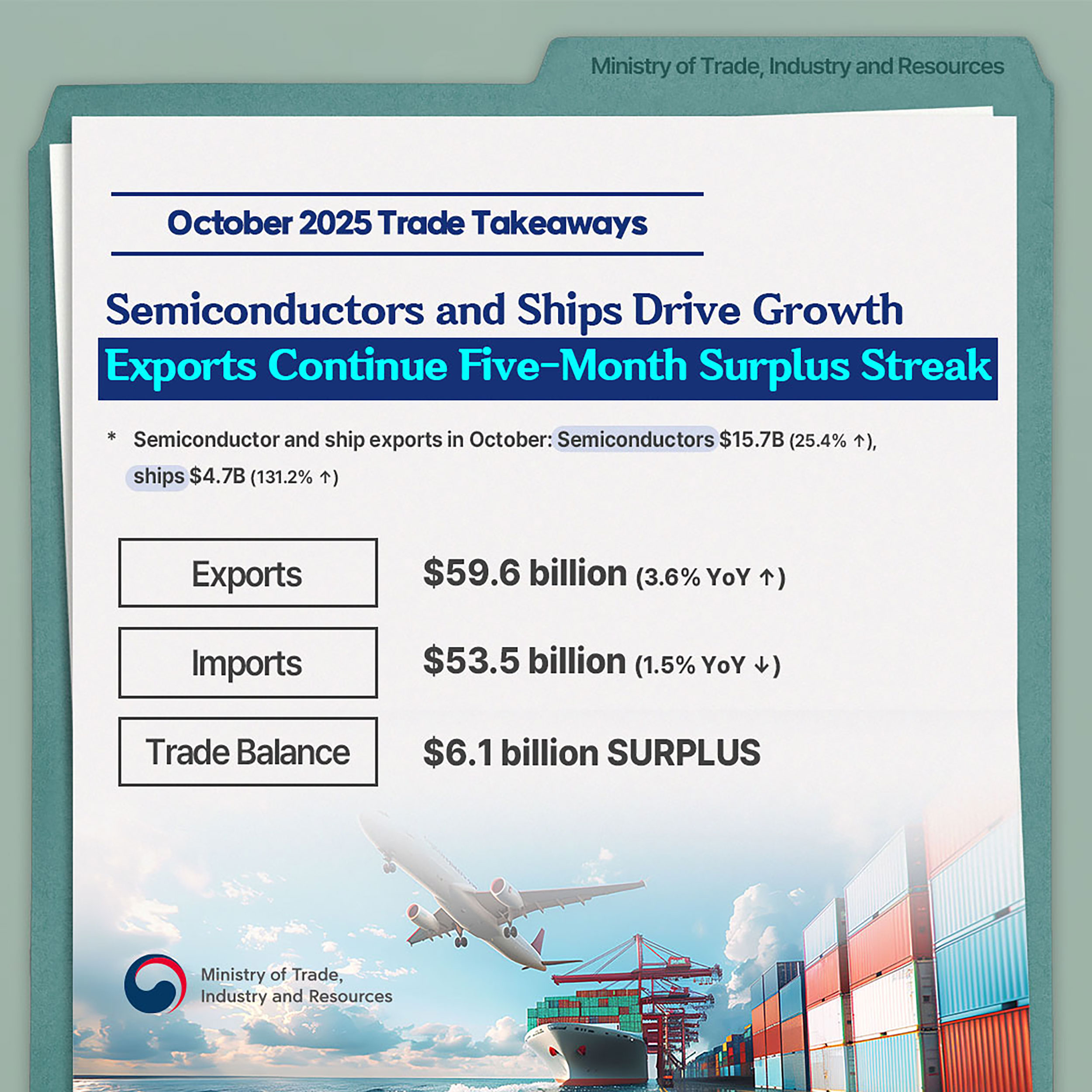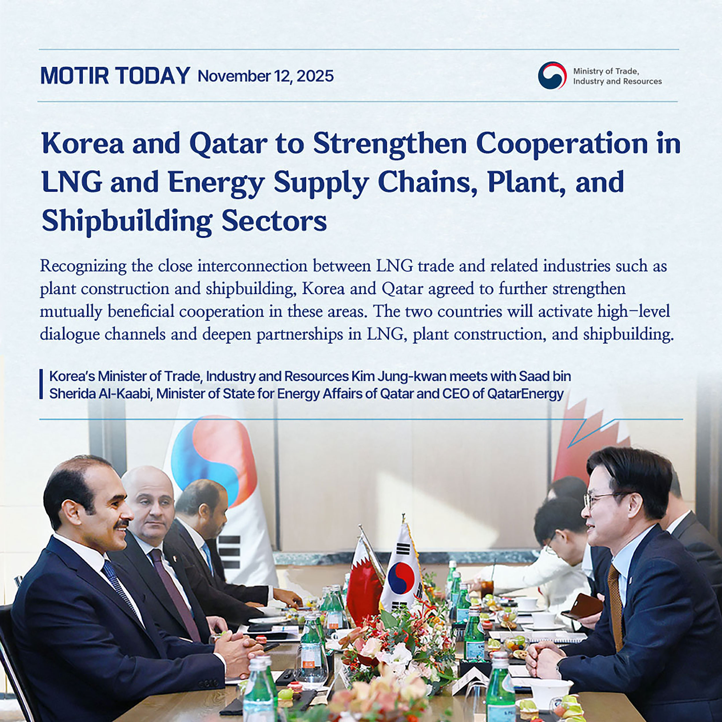 October 2025 Retail Industry Takeaways date2025-12-02 hits90 View Details Korea–UAE Accelerate Cooperation in Trade, Nuclear Exports, and High-Tech Industries! date2025-11-24 hits303 View Details Korea Fosters an Attractive Environment for the Continued Expansion of Foreign Investment! date2025-11-19 hits190 View Details October 2025 ICT Trade Takeaways date2025-11-19 hits355 View Details Korea and Qatar to Strengthen Cooperation in LNG and Energy Supply Chains, Plant, and Shipbuilding Sectors date2025-11-17 hits165 View Details October 2025 Trade Takeaways date2025-11-07 hits220 View Details New Age of Exploration: MOTIR Pledges Full Support for AI Transformation of Mid-Sized Enterprises date2025-11-07 hits185 View Details September 2025 Retail Industry Takeaway date2025-11-03 hits131 View Details Korea to Host Largest-Ever National Investment Forum, “Invest KOREA Summit” date2025-11-03 hits201 View Details first pageprev page12345next pagelast page