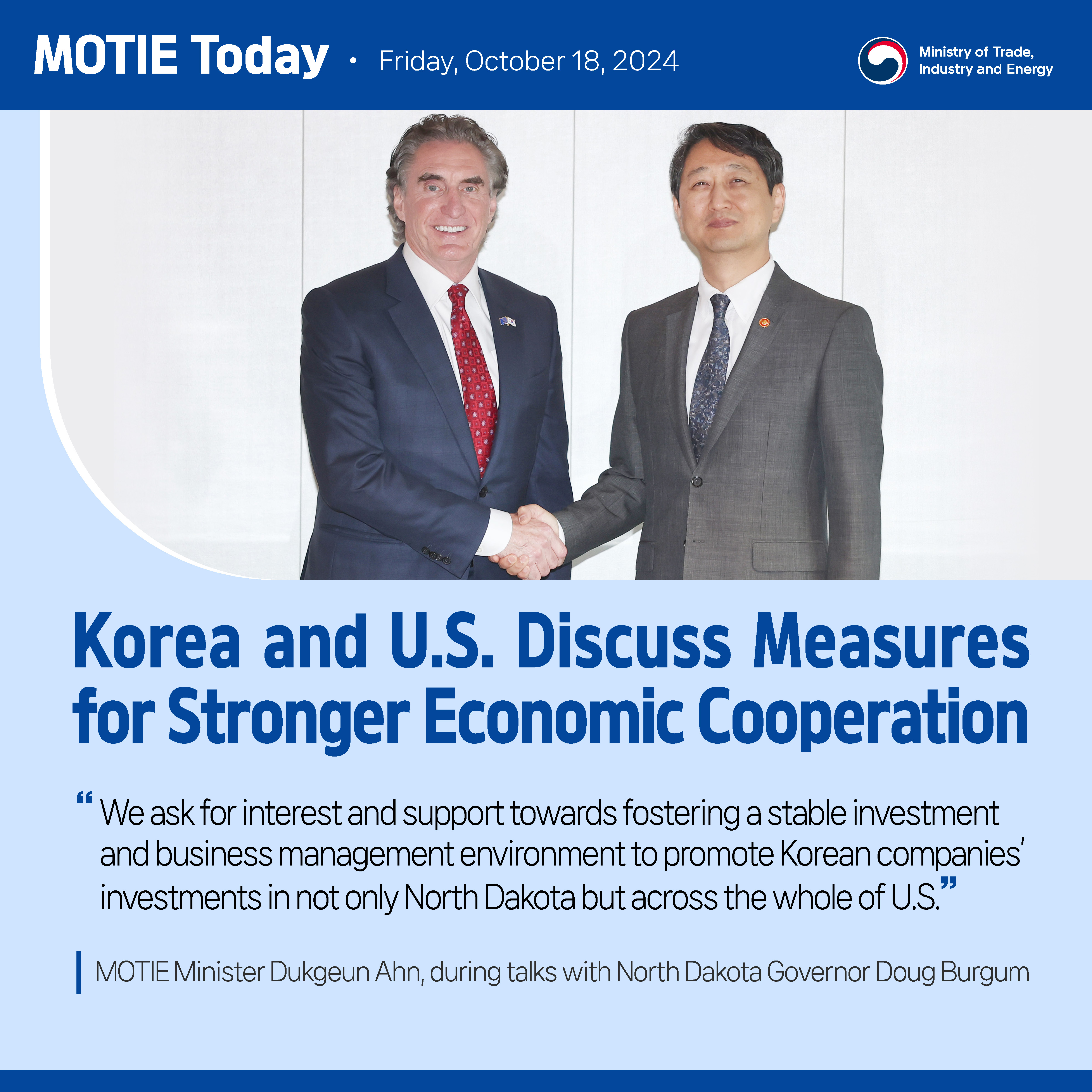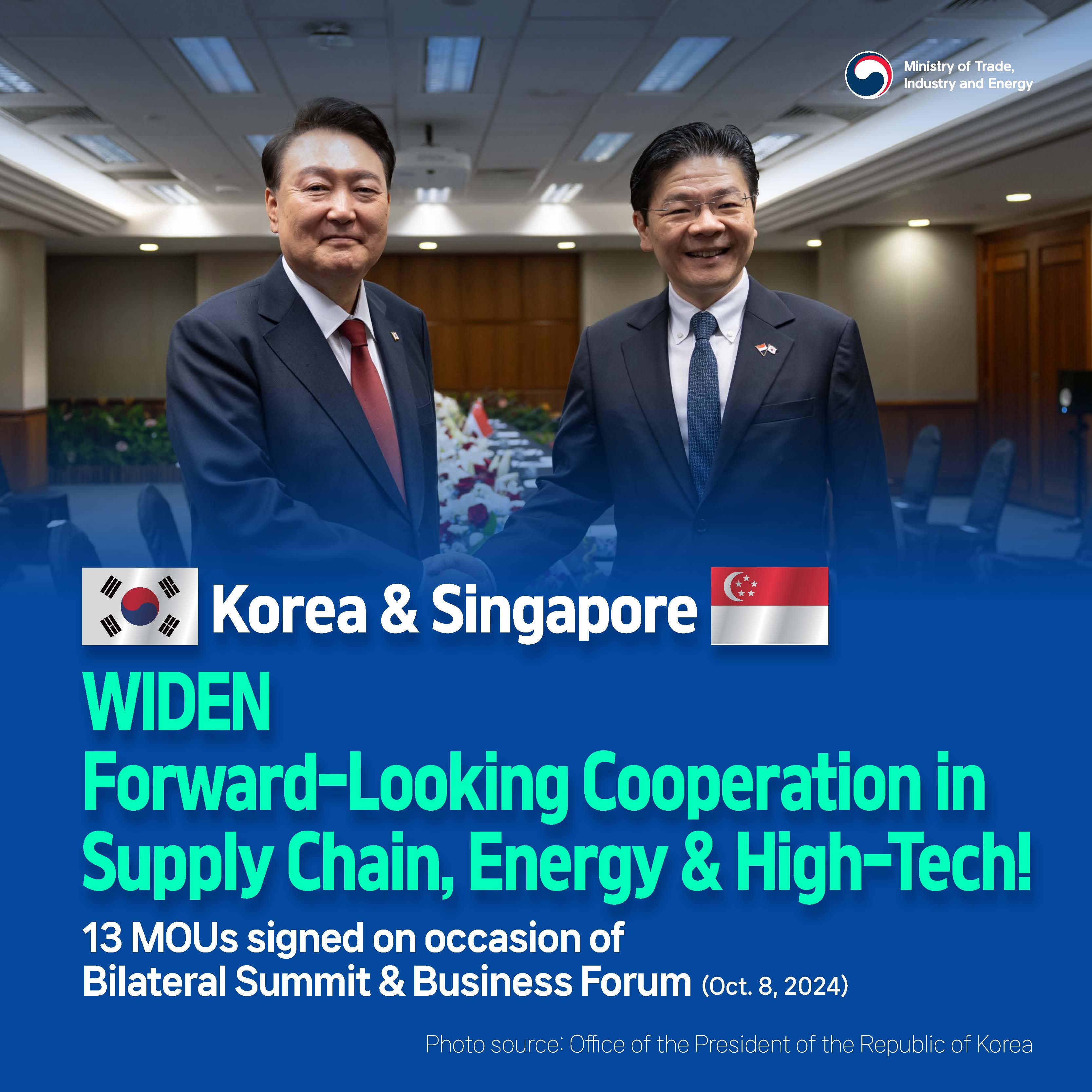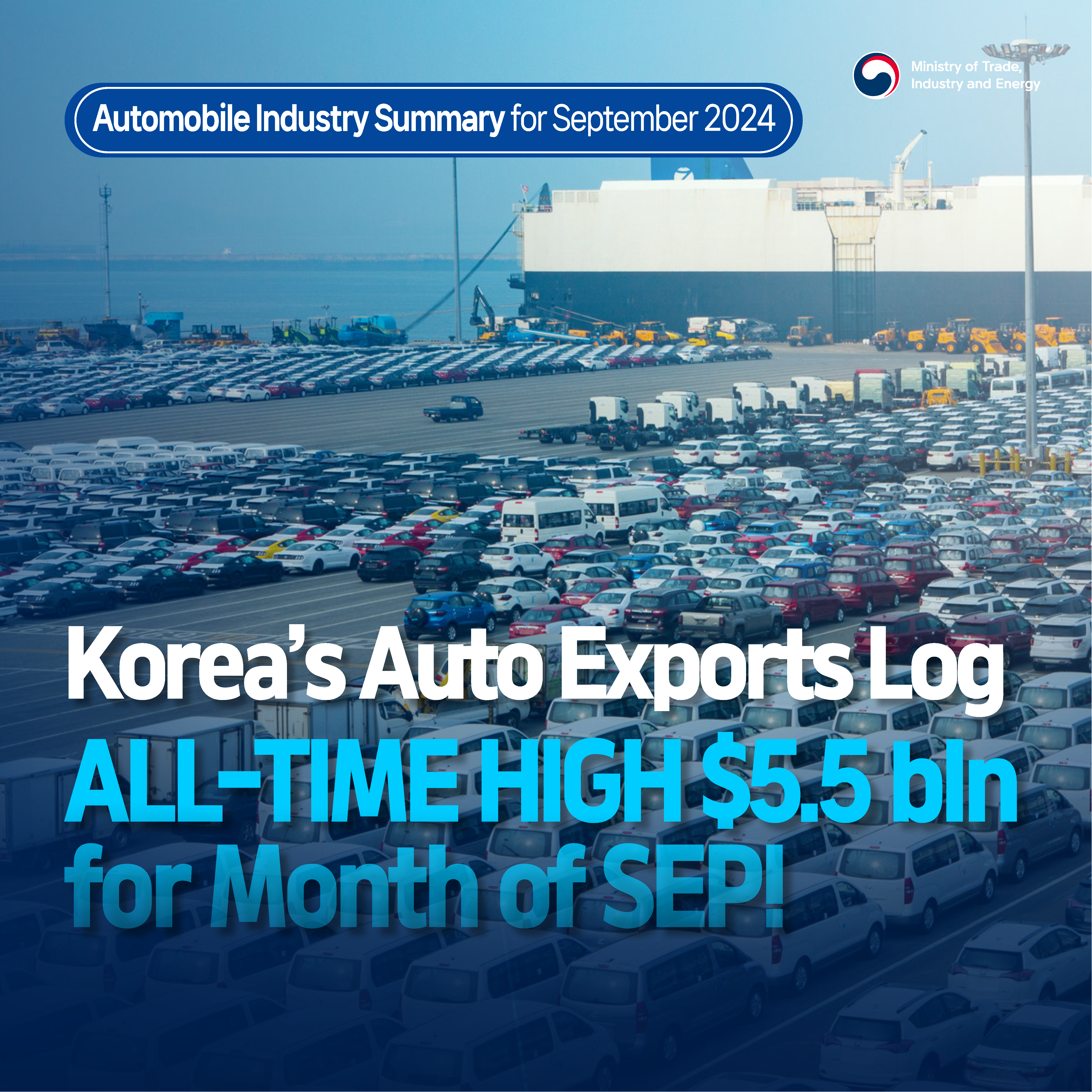 Korea and U.S. Discuss Measures for Stronger Economic Cooperation date2024-10-23 hits232 View Details Korea's September auto exports reach $5.5 bln, an all-time high for the month! date2024-10-21 hits182 View Details Korea bolsters global cooperation network to stabilize LNG supply! date2024-10-18 hits288 View Details ICT exports advance for 11 months straight! date2024-10-17 hits220 View Details Korea and Singapore widen forward-looking cooperation in supply chain, energy, and high-tech date2024-10-17 hits210 View Details Korea and Philippines to bolster supply chain and nuclear energy cooperation date2024-10-16 hits207 View Details All-time high September exports, logging monthly highs for 2024! date2024-10-10 hits210 View Details FDI pledged to Korea in Q1–Q3 reach historic $25.2 bln date2024-10-07 hits285 View Details Korea and Czech Republic join hands for stronger cooperation date2024-10-07 hits269 View Details first pageprev page1112131415next pagelast page