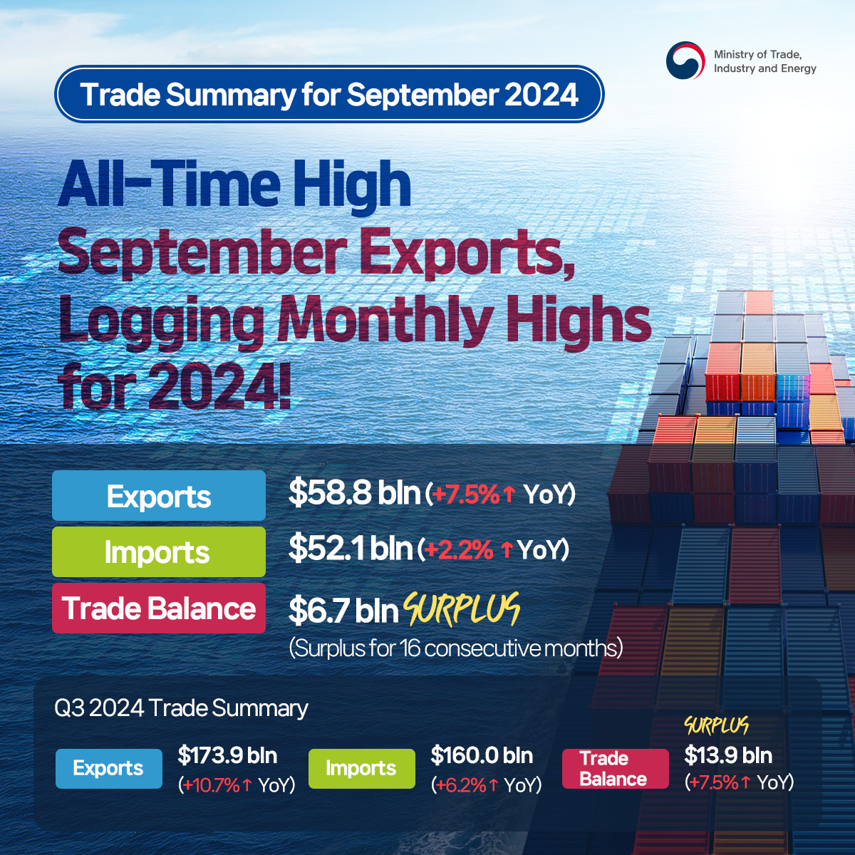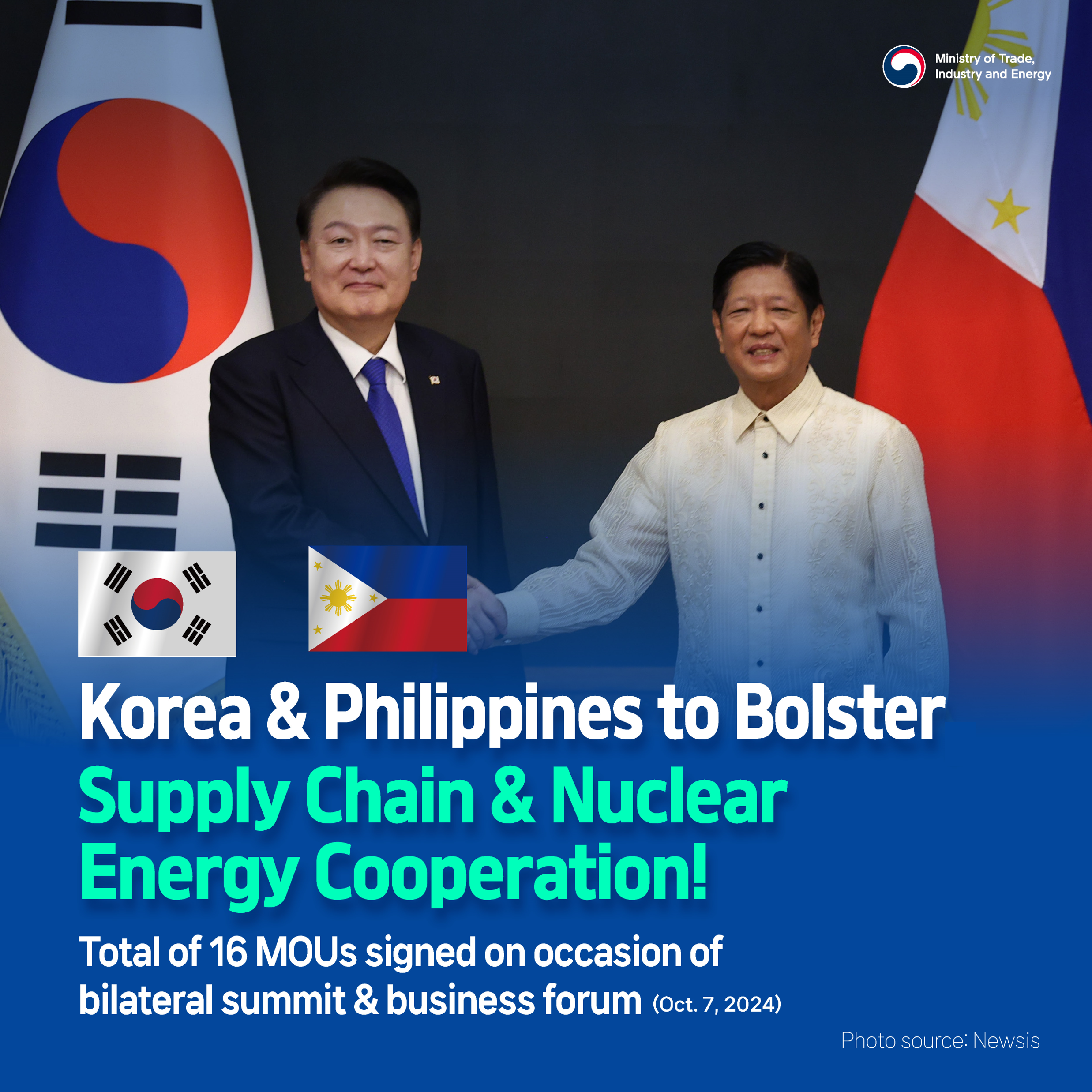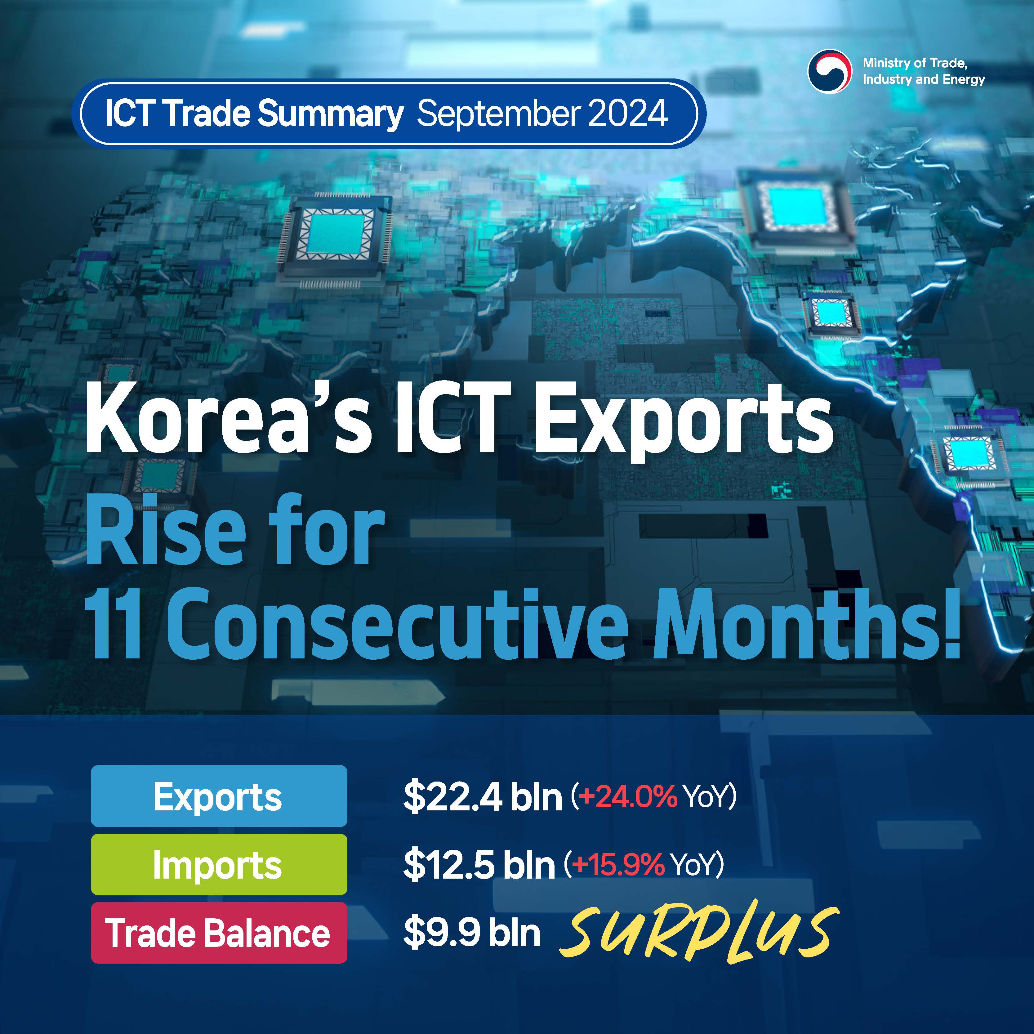 Korea and U.S. Discuss Measures for Stronger Economic Cooperation date2024-10-23 hits232 View Details Korea's September auto exports reach $5.5 bln, an all-time high for the month! date2024-10-21 hits182 View Details Korea bolsters global cooperation network to stabilize LNG supply! date2024-10-18 hits288 View Details ICT exports advance for 11 months straight! date2024-10-17 hits220 View Details Korea and Singapore widen forward-looking cooperation in supply chain, energy, and high-tech date2024-10-17 hits210 View Details Korea and Philippines to bolster supply chain and nuclear energy cooperation date2024-10-16 hits207 View Details All-time high September exports, logging monthly highs for 2024! date2024-10-10 hits210 View Details FDI pledged to Korea in Q1–Q3 reach historic $25.2 bln date2024-10-07 hits285 View Details Korea and Czech Republic join hands for stronger cooperation date2024-10-07 hits269 View Details first pageprev page1112131415next pagelast page