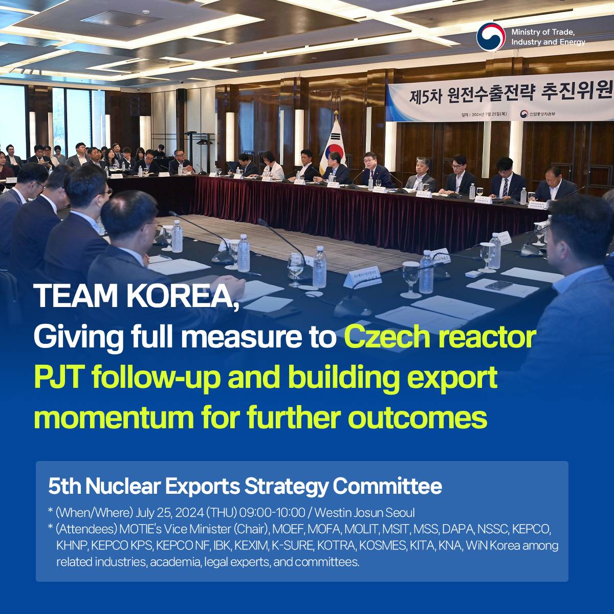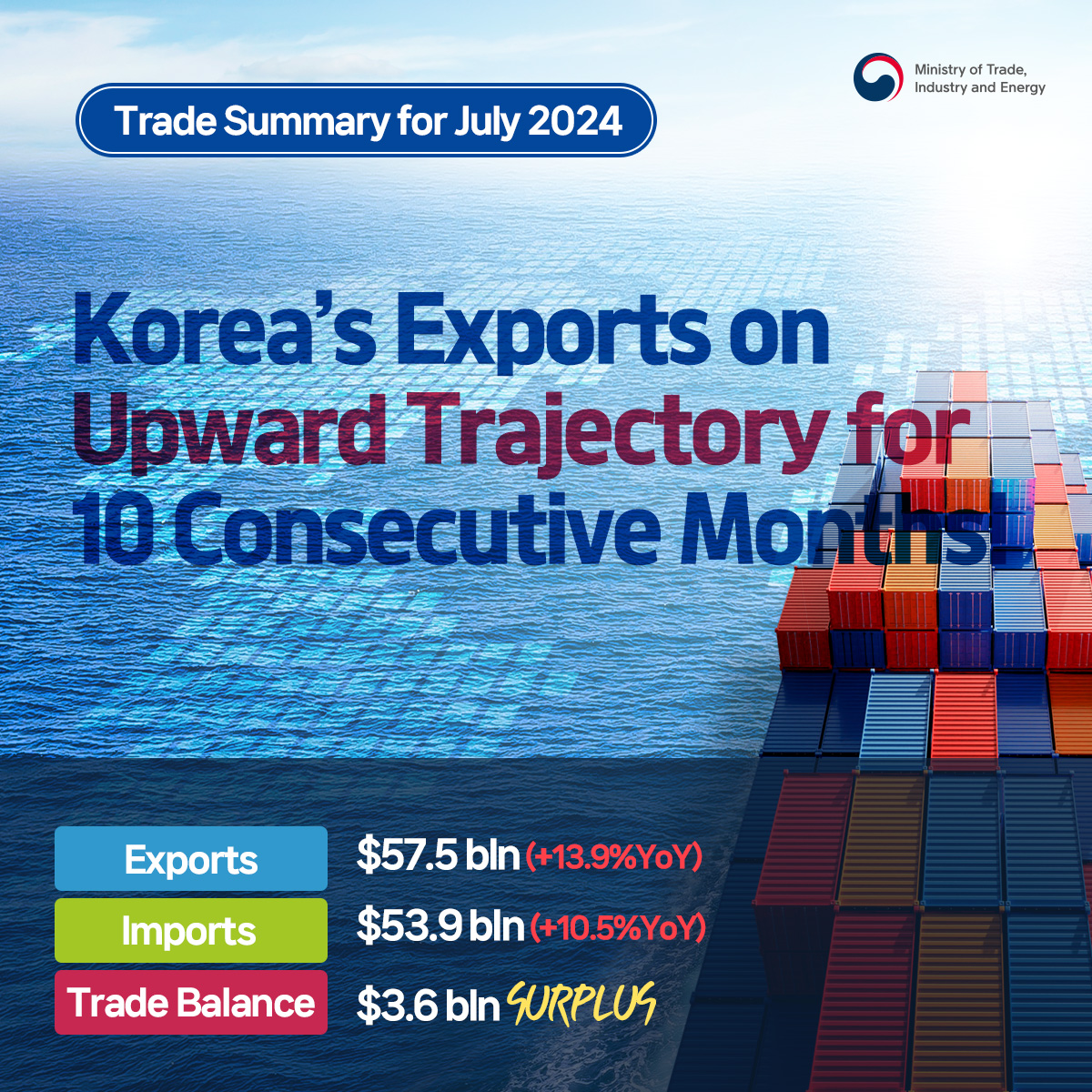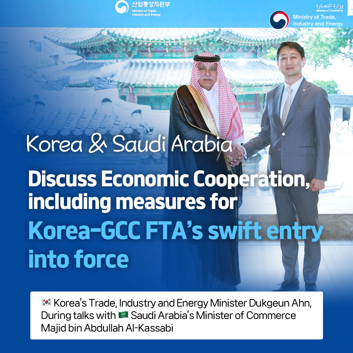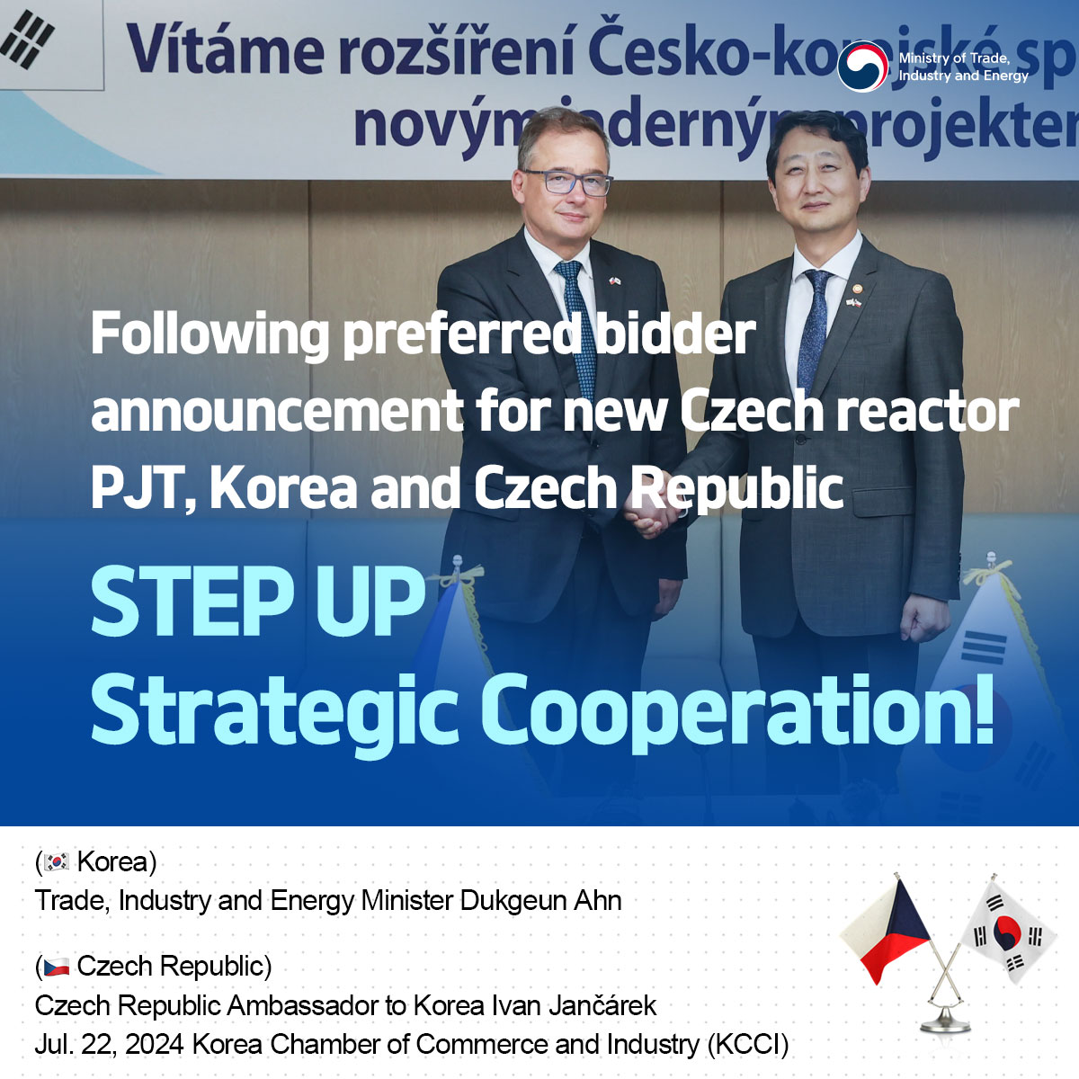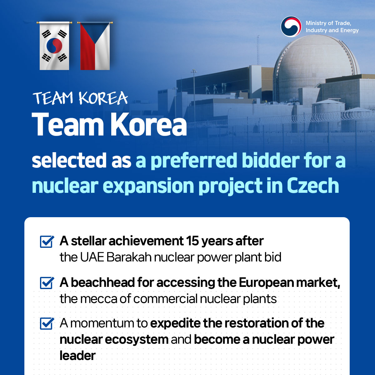 Korea's exports on upward trajectory for 10th consecutive month! date2024-08-05 hits237 View Details Korea and Saudi Arabia to make joint efforts for Korea-GCC FTA’s swift entry into force date2024-08-05 hits295 View Details Korea’s Nuclear Exports Strategy Committee consolidates follow-up efforts to Czech PJT, building further export momentum date2024-07-29 hits310 View Details Korea and Czech Republic step up strategic cooperation following new Czech reactor PJT's preferred bidder announcement date2024-07-24 hits295 View Details Korea's KHNP selected as preferred bidder for new Czech nuclear reactor PJT! date2024-07-22 hits321 View Details K-automobiles racing across the world with historic $37 bln H1 exports! date2024-07-22 hits331 View Details Korea's ICT exports enter 30% growth rate thresholds for 3rd consecutive month! date2024-07-17 hits274 View Details MOTIE, CNC and Samsung Electronics sign MOU on energy reduction & carbon reduction date2024-07-15 hits261 View Details Design goes all out with AI! date2024-07-11 hits285 View Details first pageprev page1112131415next pagelast page