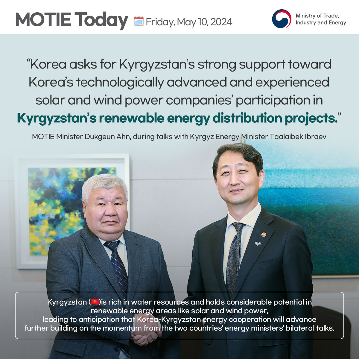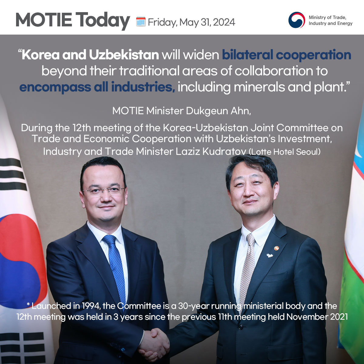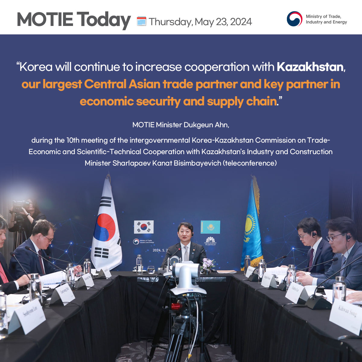 12th meeting of the Korea-Uzbekistan Joint Committee on Trade and Economic Cooperation date2024-06-07 hits362 View Details Korea and UAE formally sign CEPA deal date2024-06-04 hits273 View Details Online sales climb sharpest in 3 years and 3 months! date2024-05-30 hits359 View Details Korea and Kazakhstan hold 10th meeting of Trade-Economic and Scientific-Technical Cooperation Commission date2024-05-28 hits453 View Details Korea and Indonesia hold 1st bilateral trade & industry ministers' meeting in 2024 date2024-05-24 hits302 View Details Minister Ahn discusses cooperation with Climate Group CEO date2024-05-23 hits424 View Details Minister Ahn discusses renewables PJTs with Kyrgyzstan's Energy Minister date2024-05-23 hits306 View Details ICT exports advance for 6 months straight! date2024-05-23 hits247 View Details MOTIE launches AI Industrial Policy Committee, laying out roadmap for AI era date2024-05-16 hits331 View Details first pageprev page1617181920next pagelast page