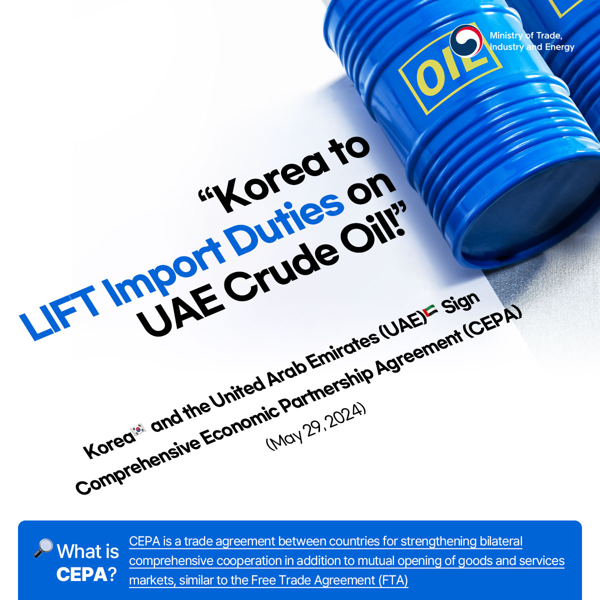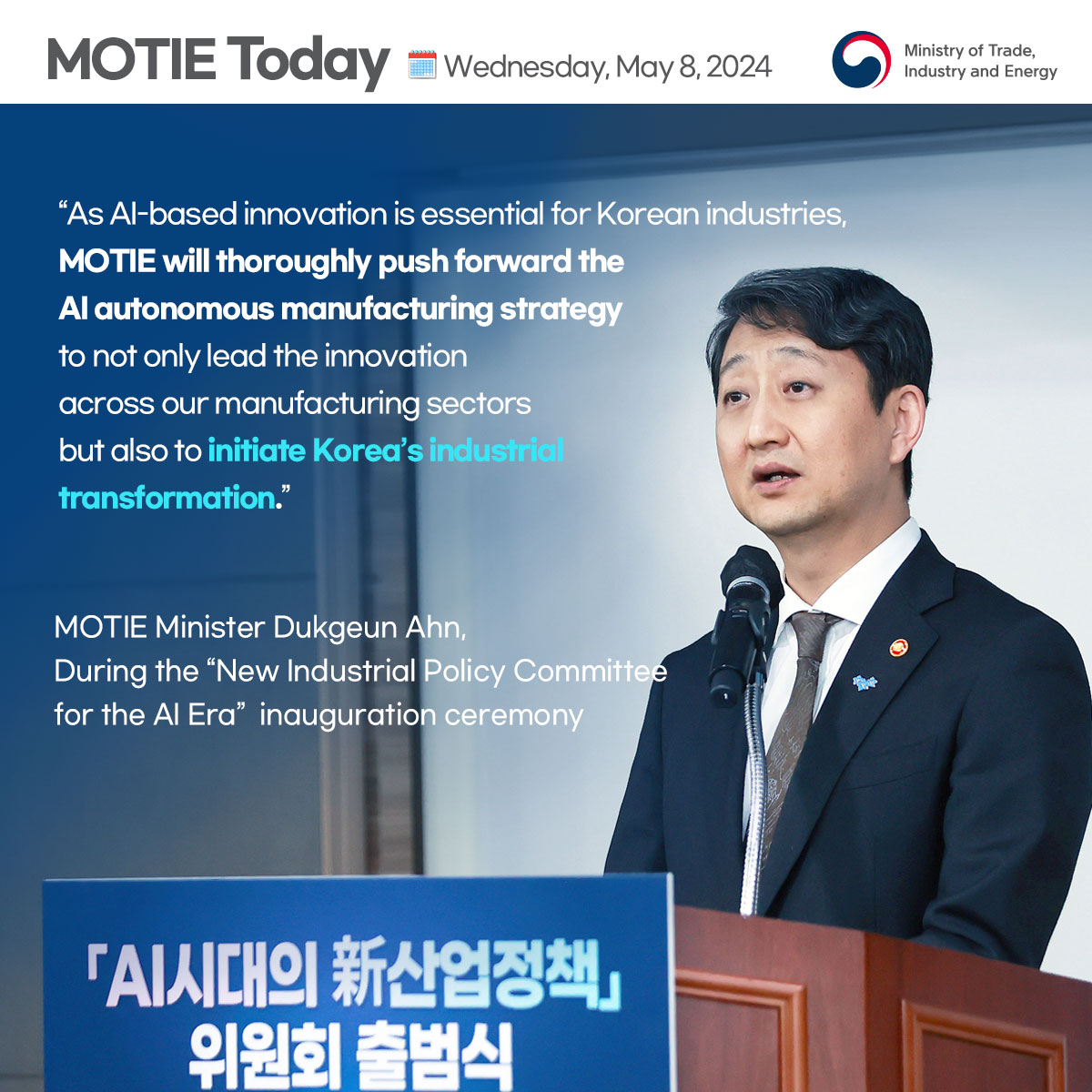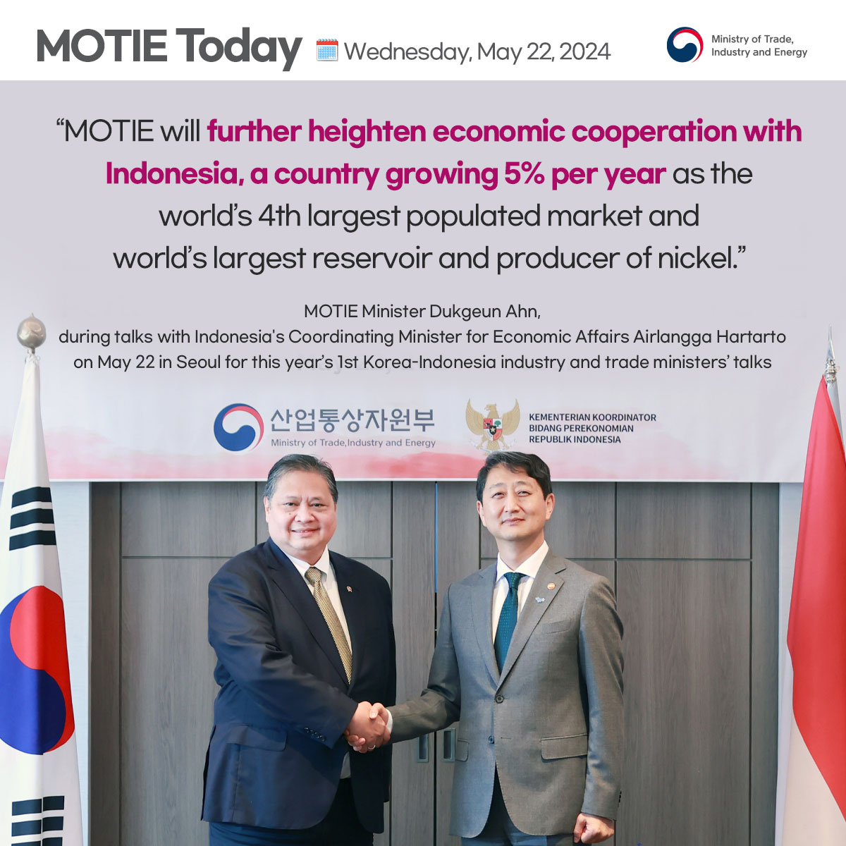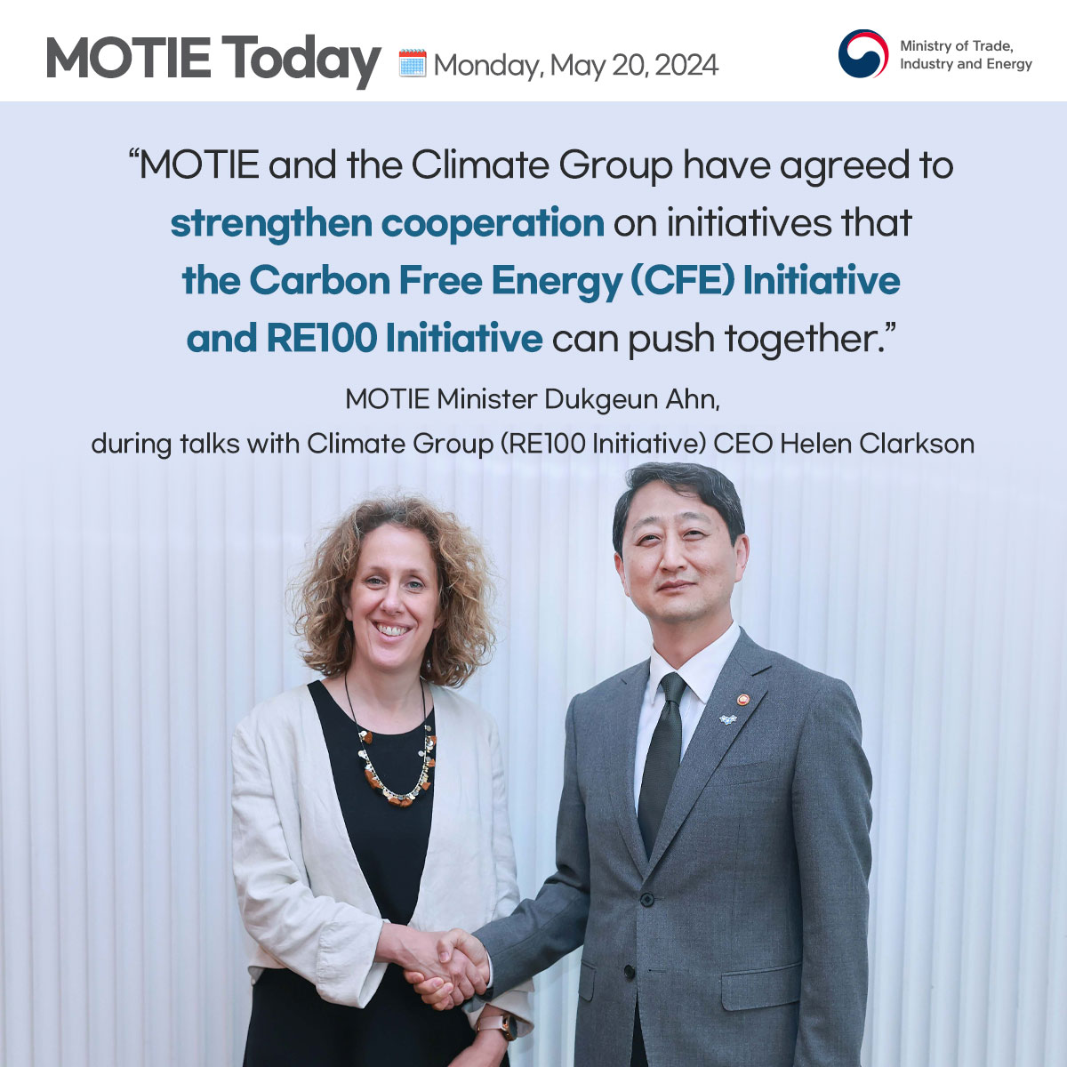 12th meeting of the Korea-Uzbekistan Joint Committee on Trade and Economic Cooperation date2024-06-07 hits362 View Details Korea and UAE formally sign CEPA deal date2024-06-04 hits273 View Details Online sales climb sharpest in 3 years and 3 months! date2024-05-30 hits359 View Details Korea and Kazakhstan hold 10th meeting of Trade-Economic and Scientific-Technical Cooperation Commission date2024-05-28 hits453 View Details Korea and Indonesia hold 1st bilateral trade & industry ministers' meeting in 2024 date2024-05-24 hits302 View Details Minister Ahn discusses cooperation with Climate Group CEO date2024-05-23 hits424 View Details Minister Ahn discusses renewables PJTs with Kyrgyzstan's Energy Minister date2024-05-23 hits306 View Details ICT exports advance for 6 months straight! date2024-05-23 hits247 View Details MOTIE launches AI Industrial Policy Committee, laying out roadmap for AI era date2024-05-16 hits331 View Details first pageprev page1617181920next pagelast page