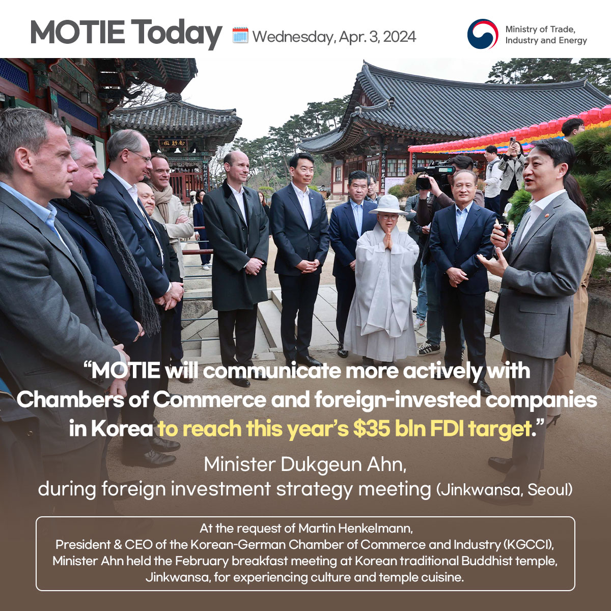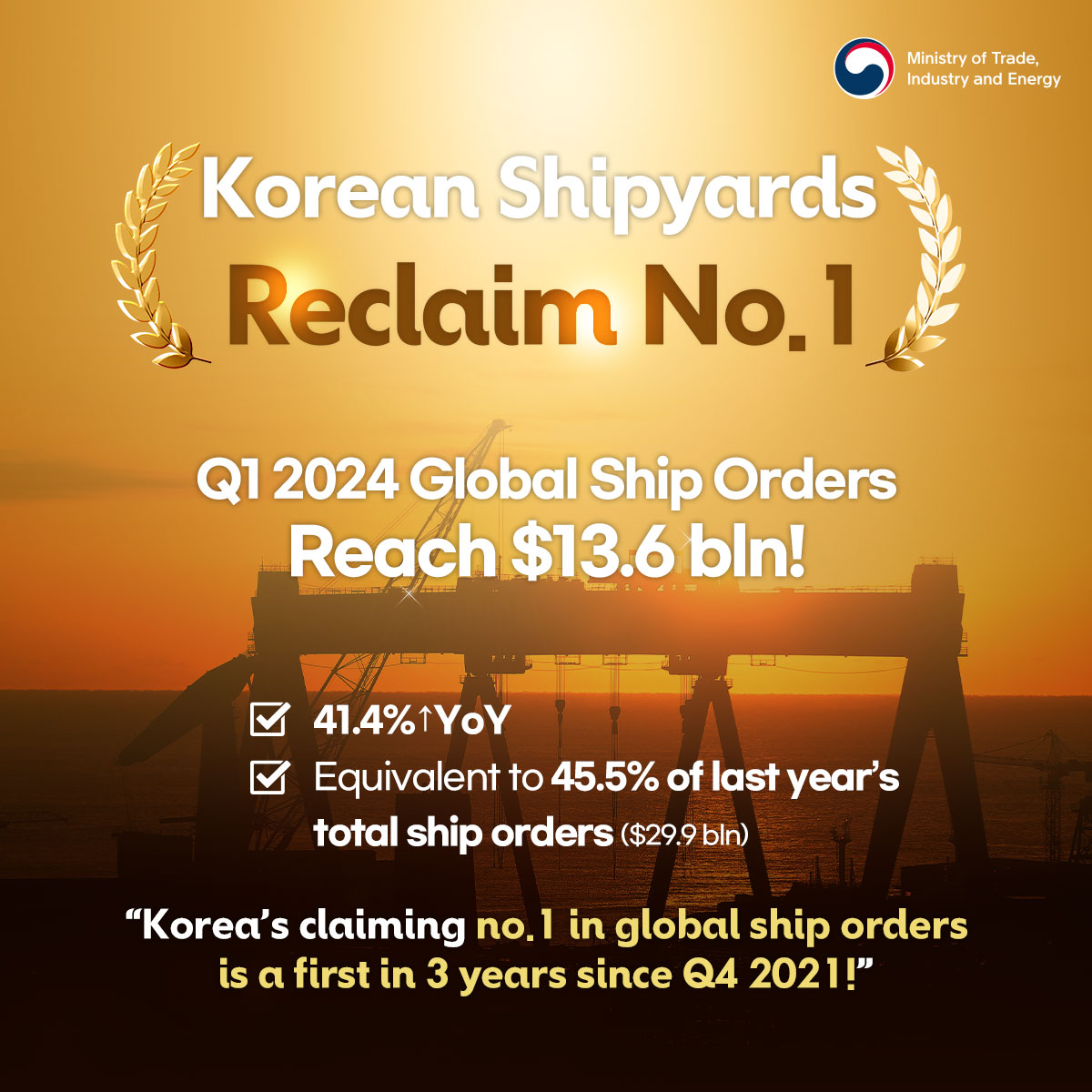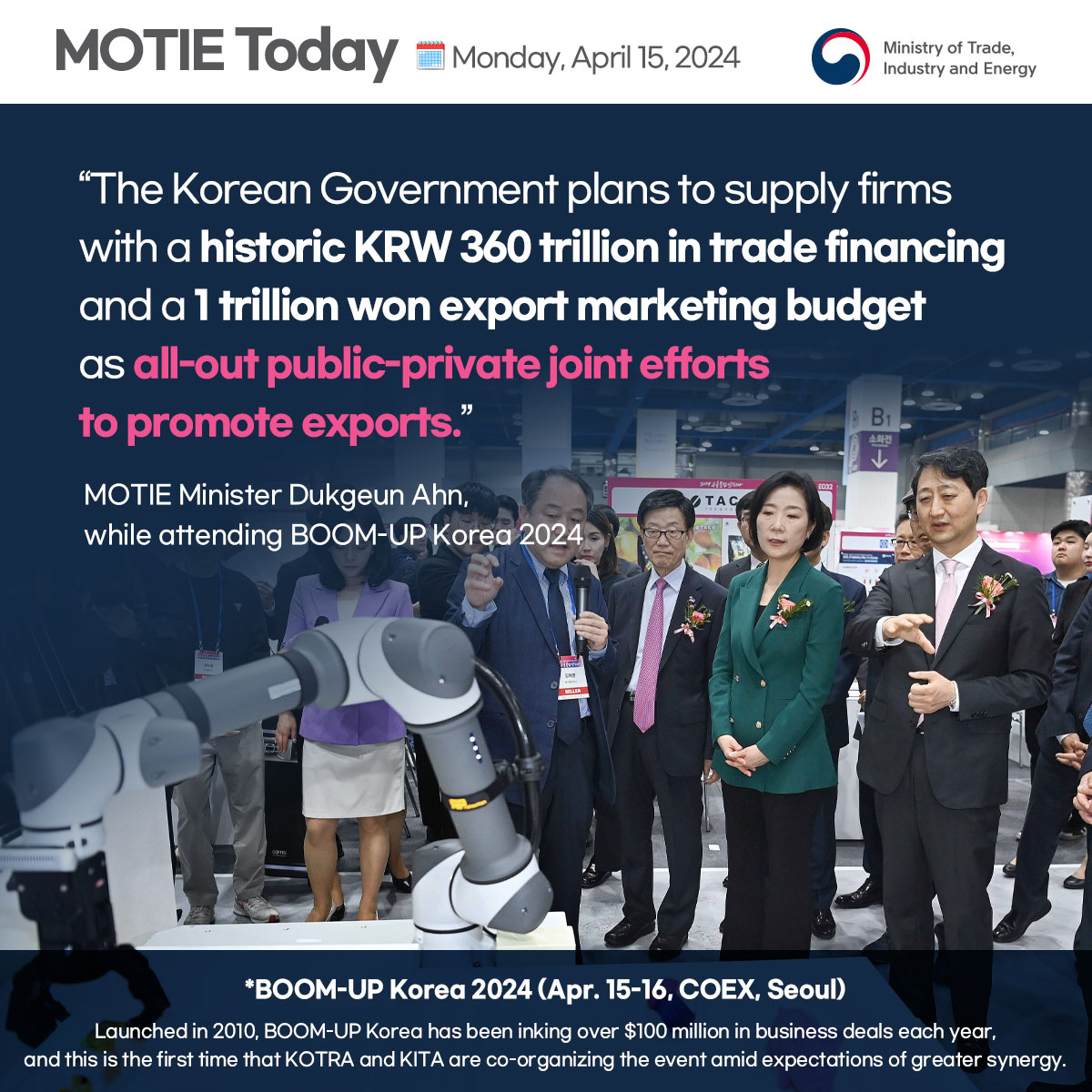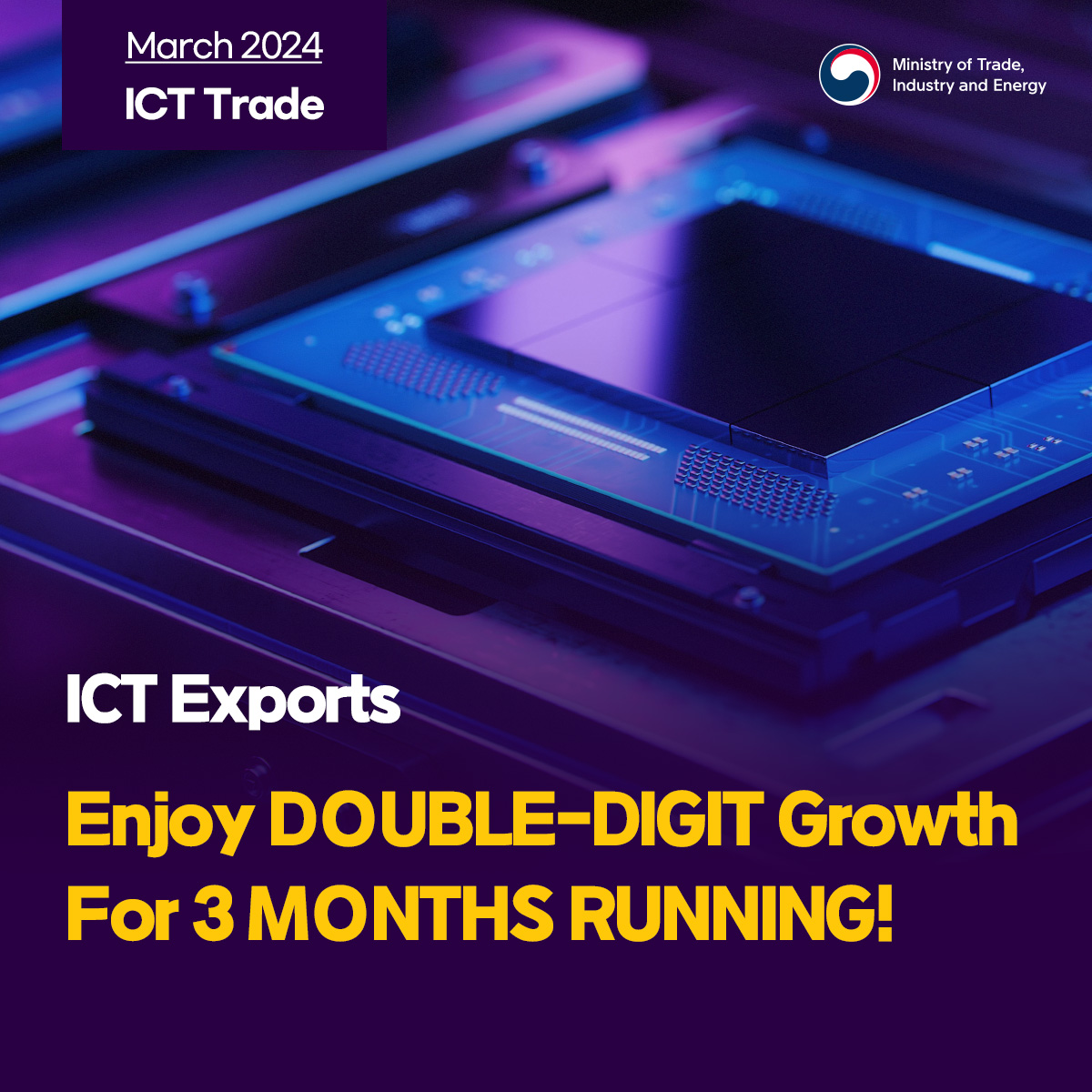 Korea's ICT exports enjoy double-digit growth for 3 months running! date2024-04-19 hits334 View Details Korea's hybrid car exports GO HIGH! date2024-04-19 hits270 View Details Minister Ahn attends BOOM-UP Korea 2024 date2024-04-19 hits234 View Details K-AI, aiming for global top 3! date2024-04-15 hits357 View Details Government to nurture MPE specialization complexes into key bases for supply chain and super gap date2024-04-11 hits298 View Details Korea reclaims no.1 in global shipbuilding orders date2024-04-11 hits329 View Details Minister Ahn holds foreign investment strategy meeting date2024-04-11 hits446 View Details FDI pledged to Korea hits record-breaking $7.1 bln for Q1 2024 date2024-04-11 hits388 View Details Korea aiming to export $10 bln in biopharmaceuticals by 2030 date2024-04-11 hits58 View Details first pageprev page1617181920next pagelast page