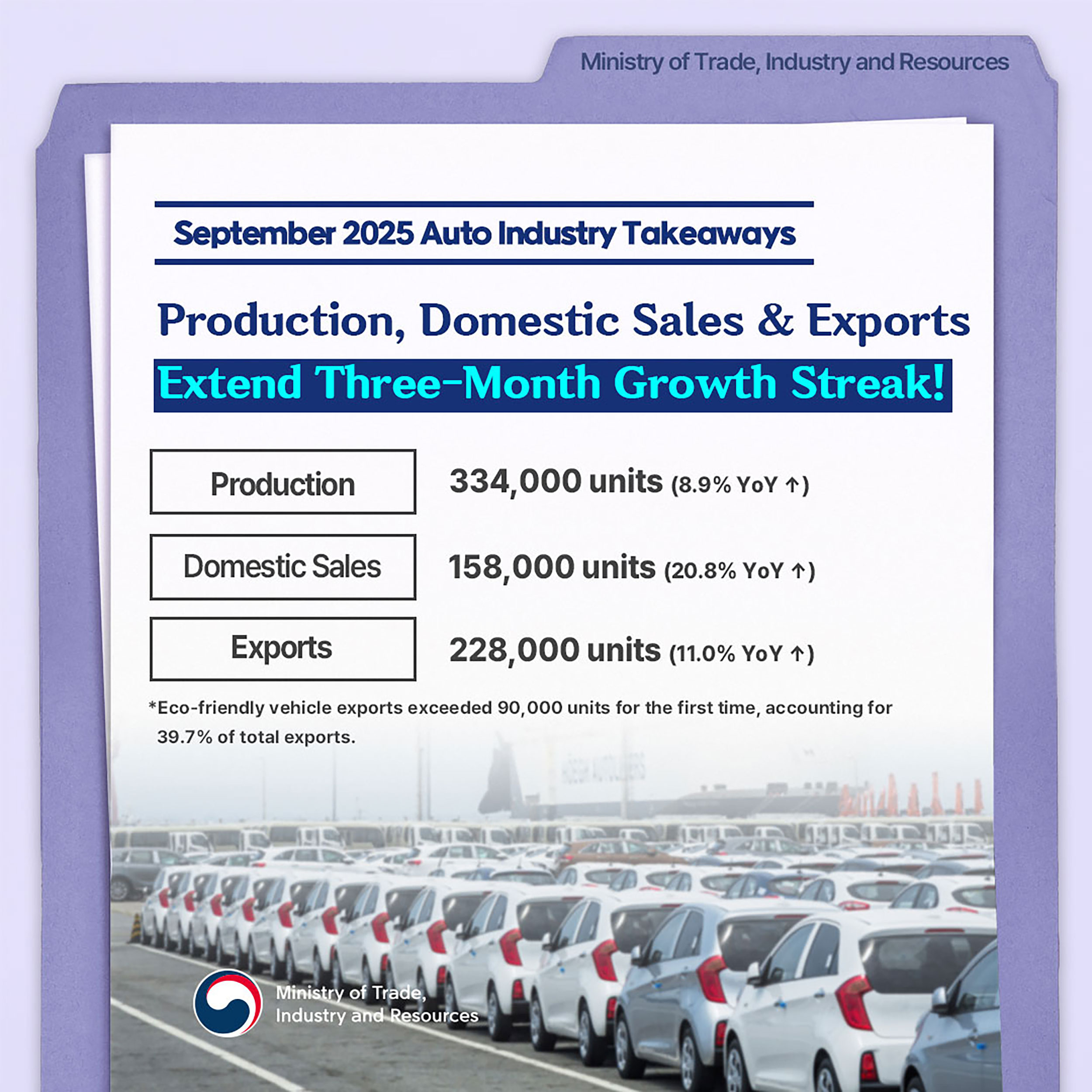 September 2025 Auto Industry Takeaways date2025-10-23 hits186 View Details Korea and Kazakhstan to Expand Cooperation in Manufacturing, Plant Construction, and Critical Minerals date2025-10-17 hits323 View Details September 2025 ICT Trade Takeaways date2025-10-14 hits173 View Details September 2025 Trade Takeaways date2025-10-02 hits189 View Details August 2025 Auto Industry Takeaways date2025-09-19 hits506 View Details August 2025 ICT Trade Takeaways date2025-09-16 hits607 View Details August 2025 Trade Summary date2025-09-02 hits1,028 View Details July 2025 Retail Industry Takeaways date2025-09-02 hits923 View Details APEC Economies Discuss Innovation & Cooperation for Energy Transition! date2025-09-02 hits572 View Details first pageprev page12345next pagelast page