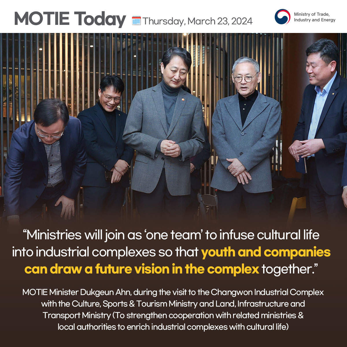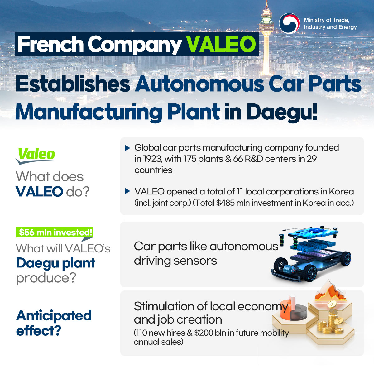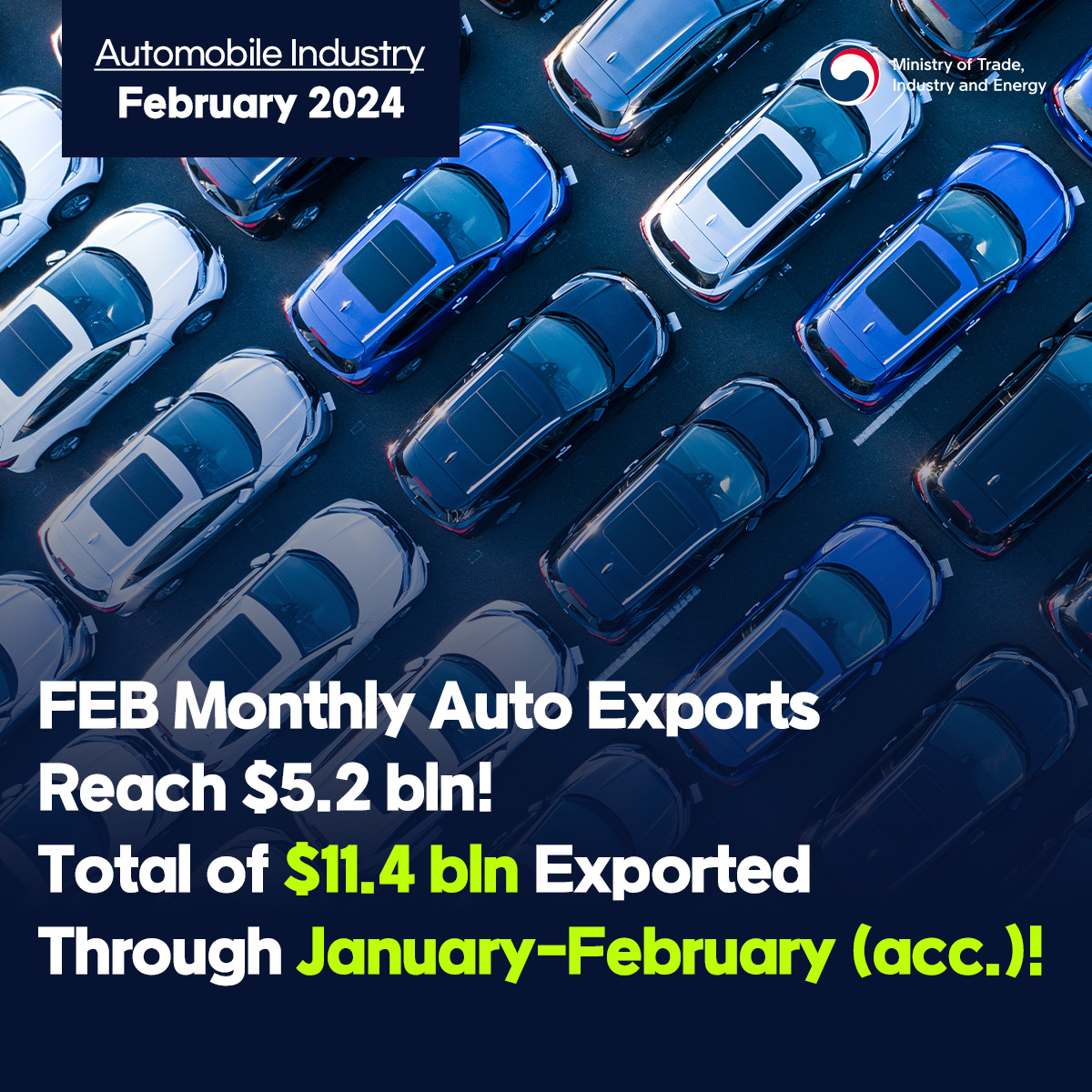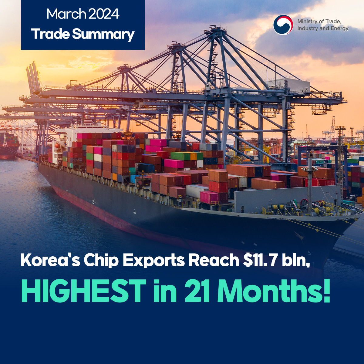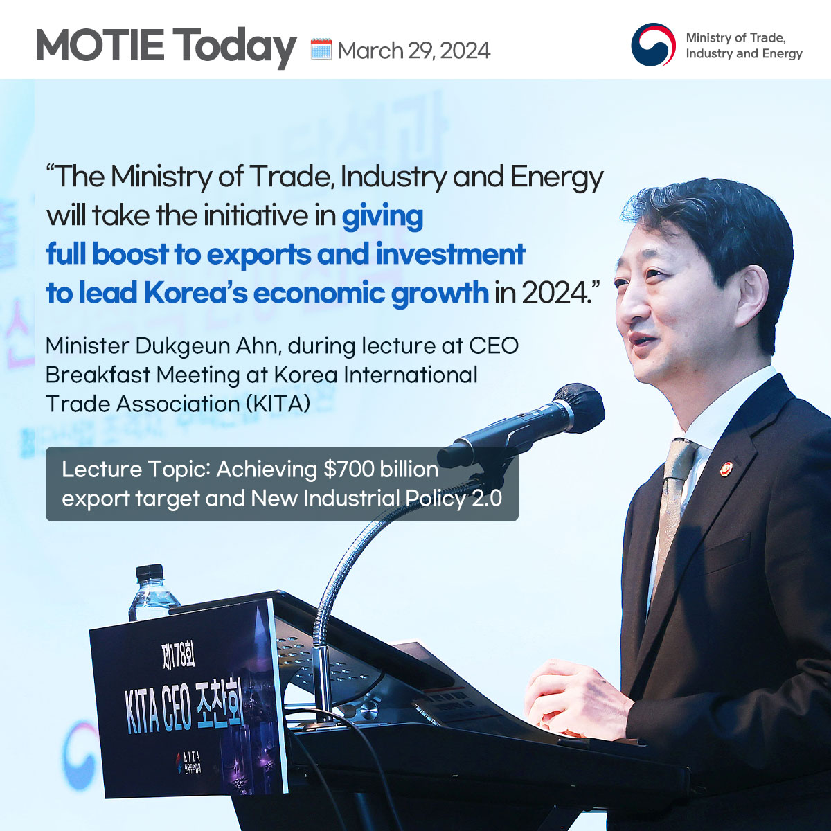 Chip exports hit $11.7 bln, highest in 21 months! date2024-04-11 hits36 View Details French company Valeo's auto parts production facility completed in Daegu date2024-04-11 hits29 View Details Minister Ahn speaks at CEO Breakfast Meeting at KITA date2024-04-09 hits303 View Details Comprehensive measures for high-tech strategic industry specialization complexes! date2024-04-03 hits362 View Details Seollal holiday demand boosts February retail sales in double digits! date2024-04-03 hits336 View Details Minister Ahn visits Changwon Industrial Complex with MCST & MOLIT date2024-04-01 hits377 View Details Trade insurance to reach all-time high in 2024! date2024-03-29 hits313 View Details Building resource security power via overseas resources development! date2024-03-26 hits287 View Details Korea's auto industry exports $11.4 bln through Jan-Feb in 2024! date2024-03-25 hits319 View Details first pageprev page1617181920next pagelast page