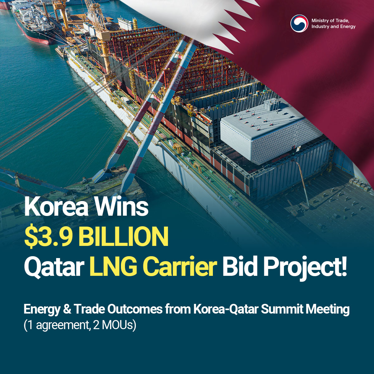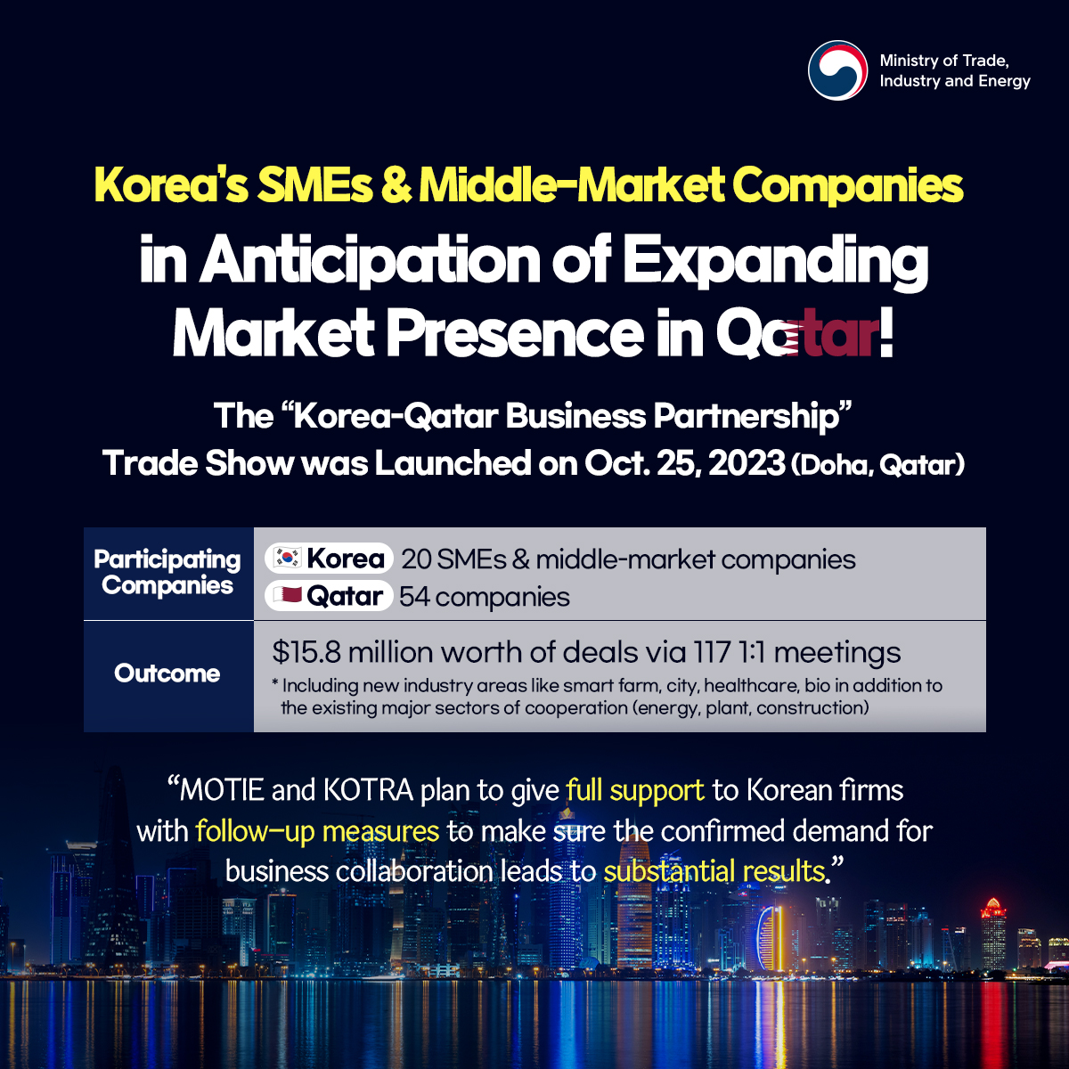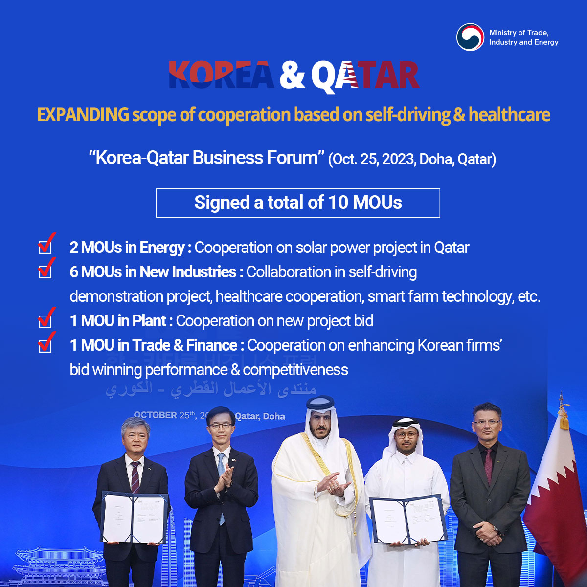 Korea's exports bounce back in October! date2023-11-15 hits35 View Details Korea's online & offline retail sales both smile wide! date2023-11-14 hits35 View Details Invest Korea Summit 2023 draws in 940 mln in FDI date2023-11-13 hits37 View Details Minister visits Latin America's hub country, Chile! date2023-11-13 hits34 View Details Korea wins $3.9 bln Qatar LNG carrier bid project! date2023-11-13 hits38 View Details Korea to build its very first automotive plant in the Middle East! date2023-11-13 hits69 View Details Korea-Saudi trade show generates an estimated $21 mln worth of deals date2023-11-10 hits35 View Details 10 MOUs signed at Korea-Qatar Business Forum! date2023-11-10 hits36 View Details Korean SMEs & middle-market firms in anticipation of expanding market presence in Qatar! date2023-11-09 hits36 View Details first pageprev page2627282930next pagelast page