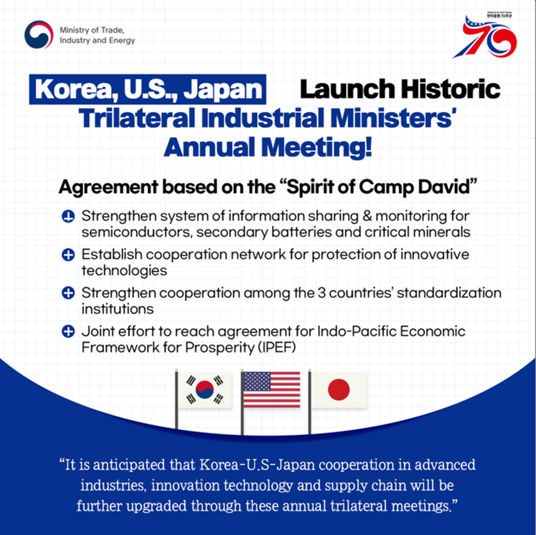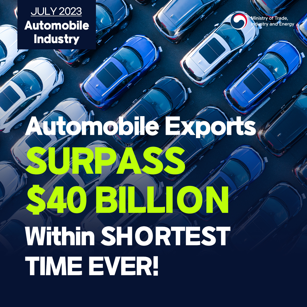 Korea-US-Japan launch historic trilateral annual meeting date2023-09-12 hits36 View Details Korea records trade surplus for 3rd consecutive month date2023-09-06 hits35 View Details Korea's online and offline retail sales are all smiles! date2023-09-06 hits34 View Details Korea's auto exports surpass $40 bln in shortest time ever! date2023-08-25 hits35 View Details Government & industry join hands to lead the global SMR market! date2023-08-25 hits33 View Details Korea's ICT exports growth rate shows rebound! date2023-08-24 hits36 View Details Designation of 7 high-tech strategic industrial specialized complexes! date2023-08-23 hits32 View Details Korea's industrial policy blueprint for H2 2023 date2023-08-22 hits89 View Details Korea to boost new energy industry exports! date2023-08-14 hits37 View Details first pageprev page2627282930next pagelast page