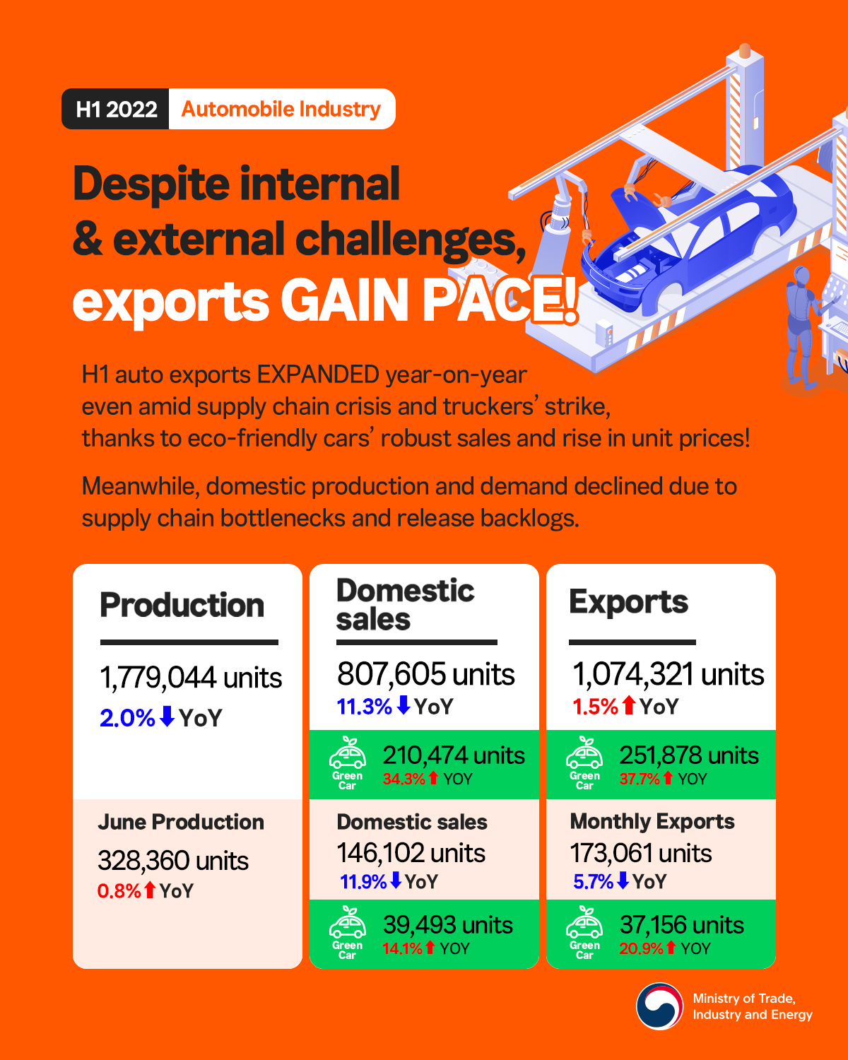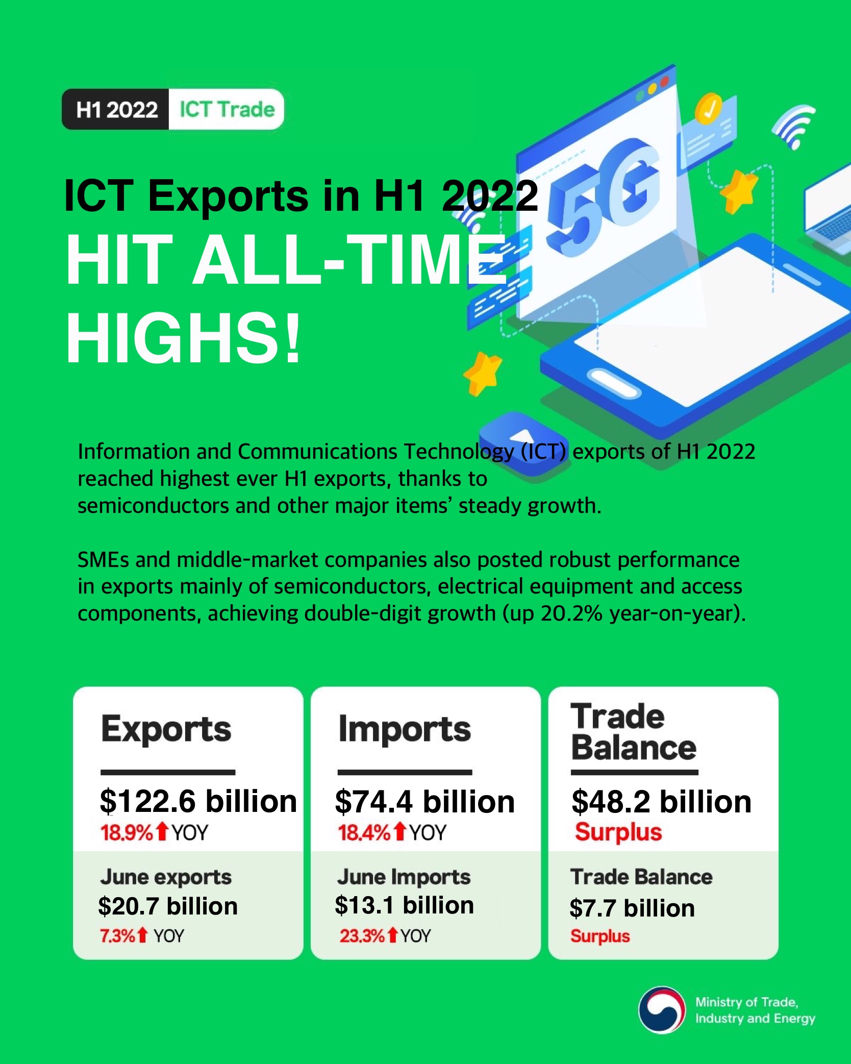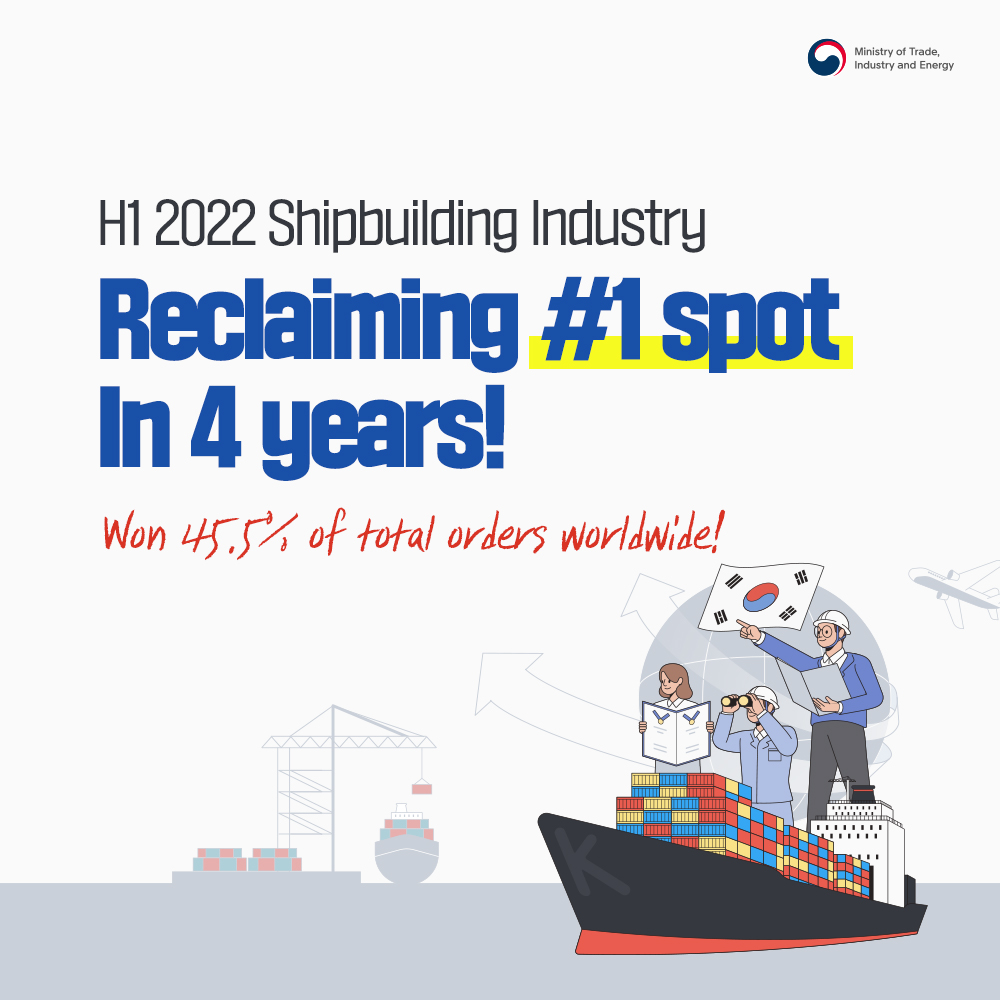 S. Korea reclaims no. 1 shipbuilder spot in 4 years! date2022-07-28 hits34 View Details FDI pledges to Korea reach $11.1 billion in H1 2022 date2022-07-20 hits37 View Details Korea's auto exports increase in both value and units in H1 2022 date2022-07-20 hits33 View Details Korea's ICT exports hit all-time highs for both June and H1 date2022-07-18 hits34 View Details MOTIE announces New Regime's Energy Policy Directions date2022-07-14 hits36 View Details Korea's H1 2022 exports achieve historic highs! date2022-07-06 hits32 View Details Korea's retail sales gain 10.1% in May! date2022-06-30 hits36 View Details South Korea, gearing up to become nuclear powerhouse! date2022-06-29 hits41 View Details Korea's auto exports regain double-digit growth after 1 year! date2022-06-16 hits37 View Details first pageprev page3637383940next pagelast page