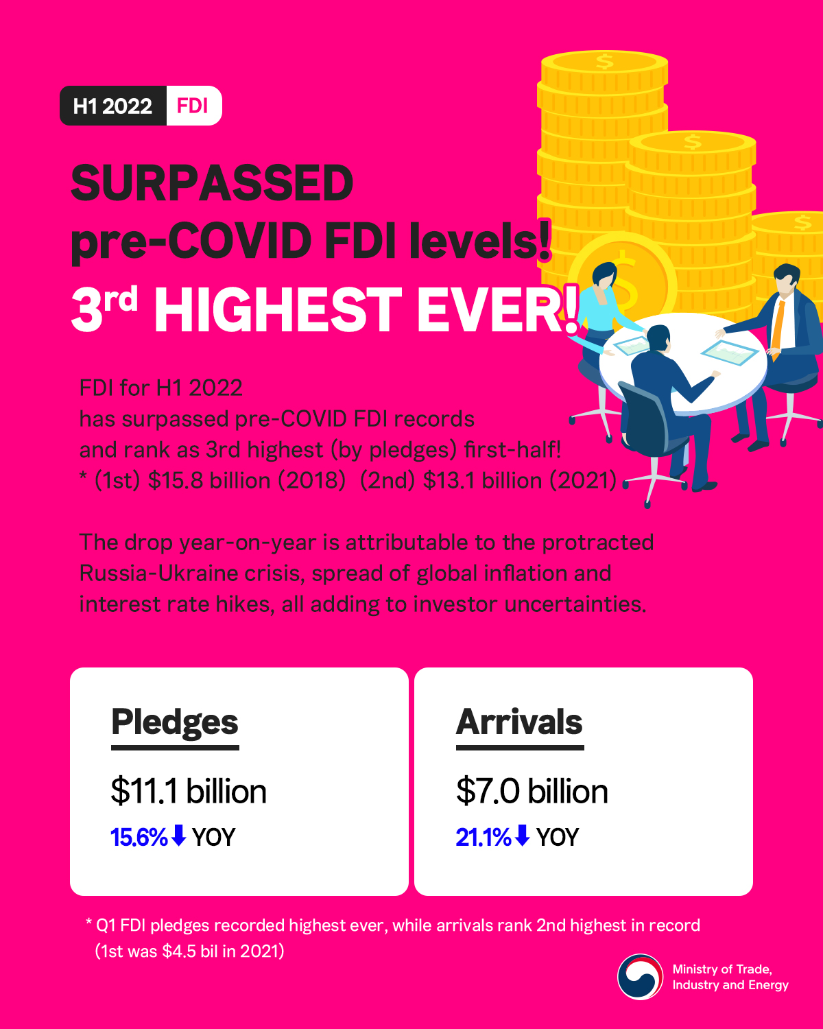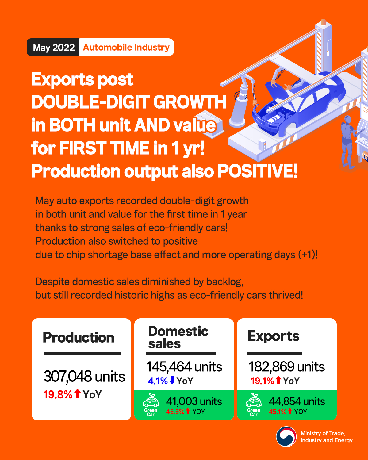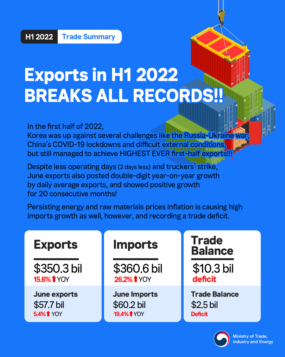 S. Korea reclaims no. 1 shipbuilder spot in 4 years! date2022-07-28 hits34 View Details FDI pledges to Korea reach $11.1 billion in H1 2022 date2022-07-20 hits37 View Details Korea's auto exports increase in both value and units in H1 2022 date2022-07-20 hits33 View Details Korea's ICT exports hit all-time highs for both June and H1 date2022-07-18 hits34 View Details MOTIE announces New Regime's Energy Policy Directions date2022-07-14 hits36 View Details Korea's H1 2022 exports achieve historic highs! date2022-07-06 hits32 View Details Korea's retail sales gain 10.1% in May! date2022-06-30 hits36 View Details South Korea, gearing up to become nuclear powerhouse! date2022-06-29 hits41 View Details Korea's auto exports regain double-digit growth after 1 year! date2022-06-16 hits37 View Details first pageprev page3637383940next pagelast page