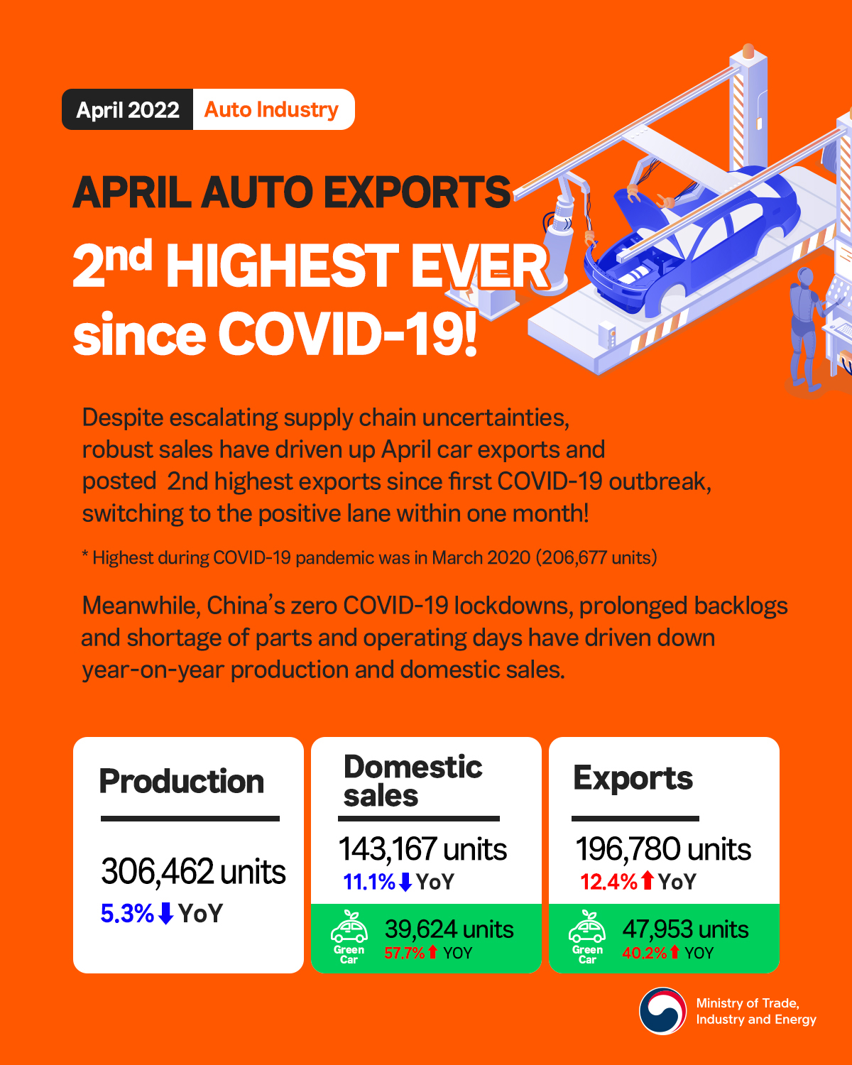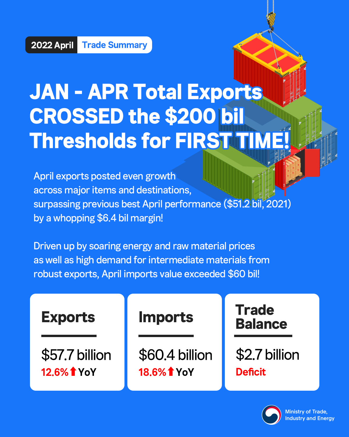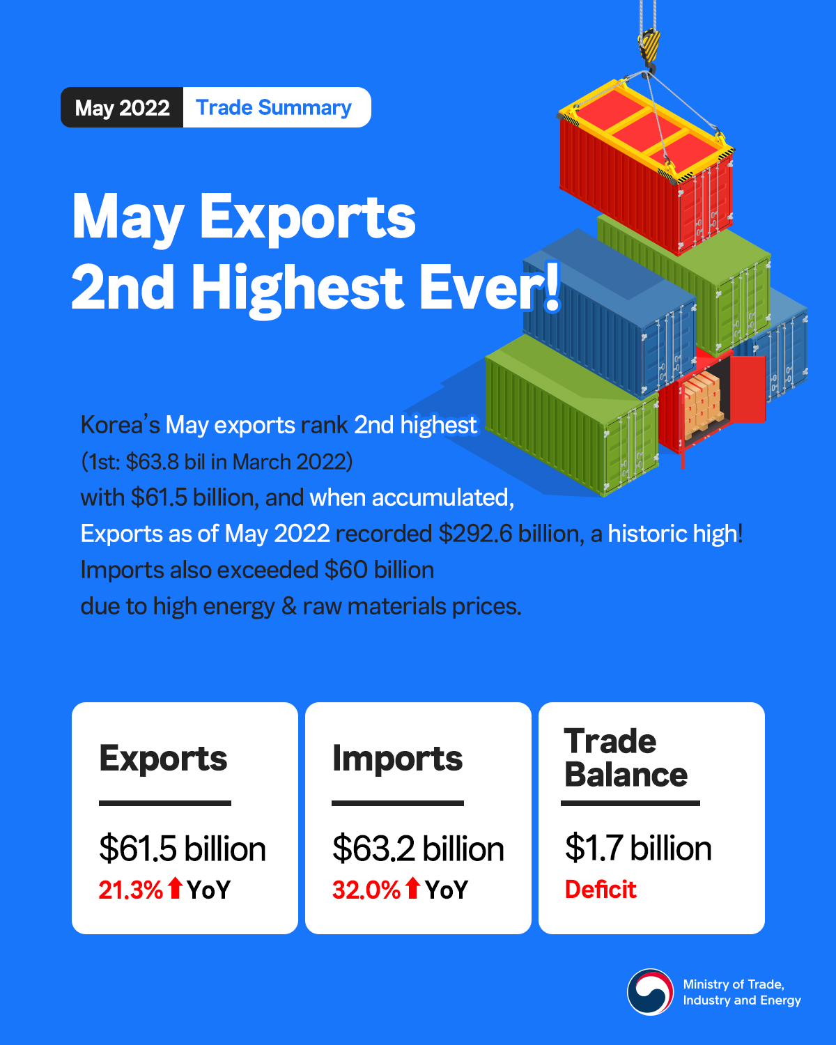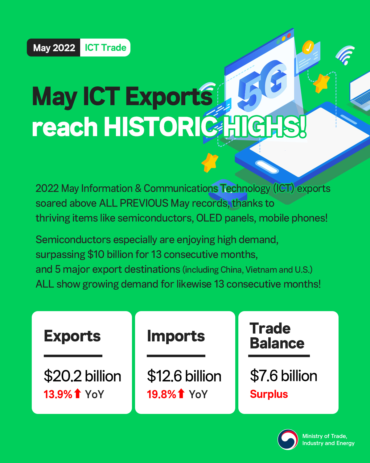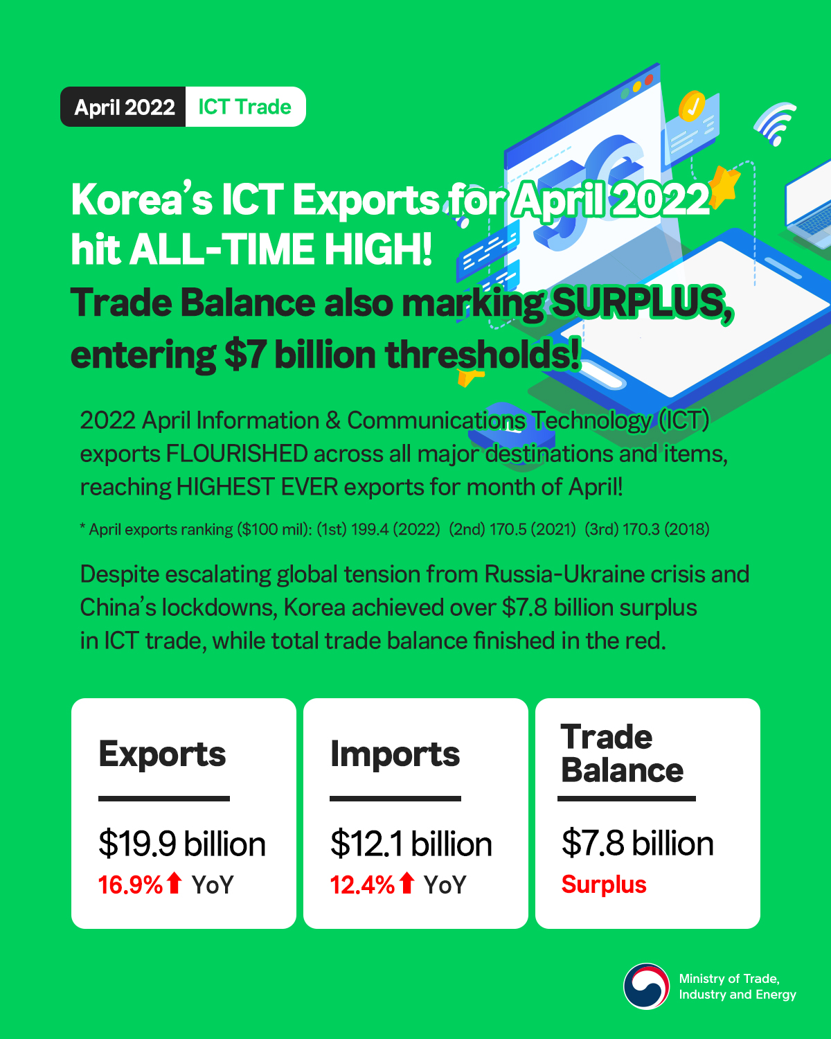 Korea's ICT exports achieve record highs for May! date2022-06-15 hits35 View Details May exports record 2nd highest ever! date2022-06-07 hits33 View Details Korea's retail industry achieves 10.6% growth in April date2022-05-31 hits37 View Details Korea-U.S. Summit: Economic Outcomes & Impact date2022-05-31 hits36 View Details What is IPEF? date2022-05-27 hits35 View Details Netflix and Korea seal $100 million investment deal to build Asia's virtual reality ecosystem date2022-05-24 hits38 View Details Korea's automobile exports reach 2nd all-time high since pandemic! date2022-05-19 hits35 View Details Korea’s ICT exports hit all-time high of $19.9 billion in April! date2022-05-16 hits38 View Details Korea's exports in Q1 2022 surpass $200 billion for first time! date2022-05-04 hits35 View Details first pageprev page3637383940next pagelast page