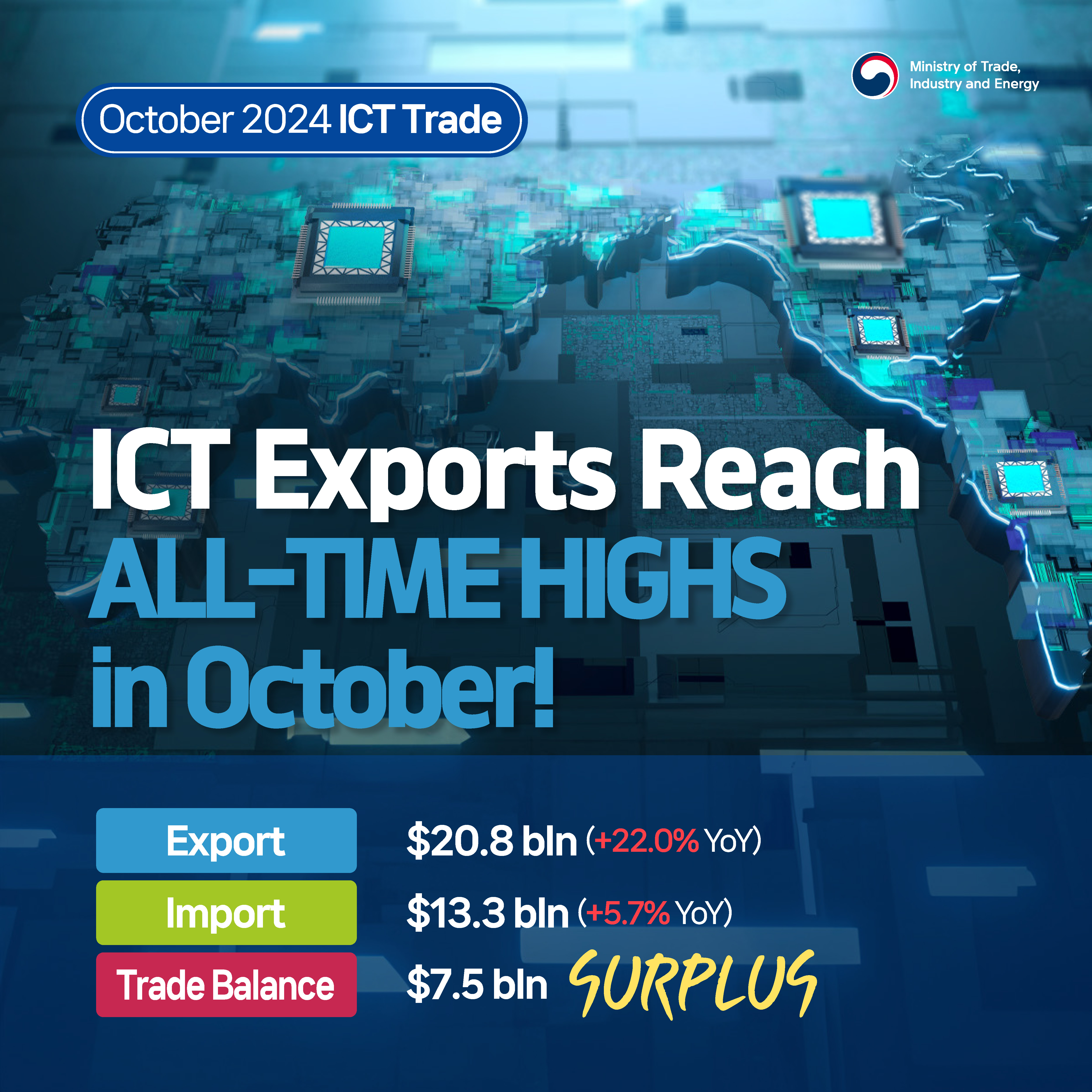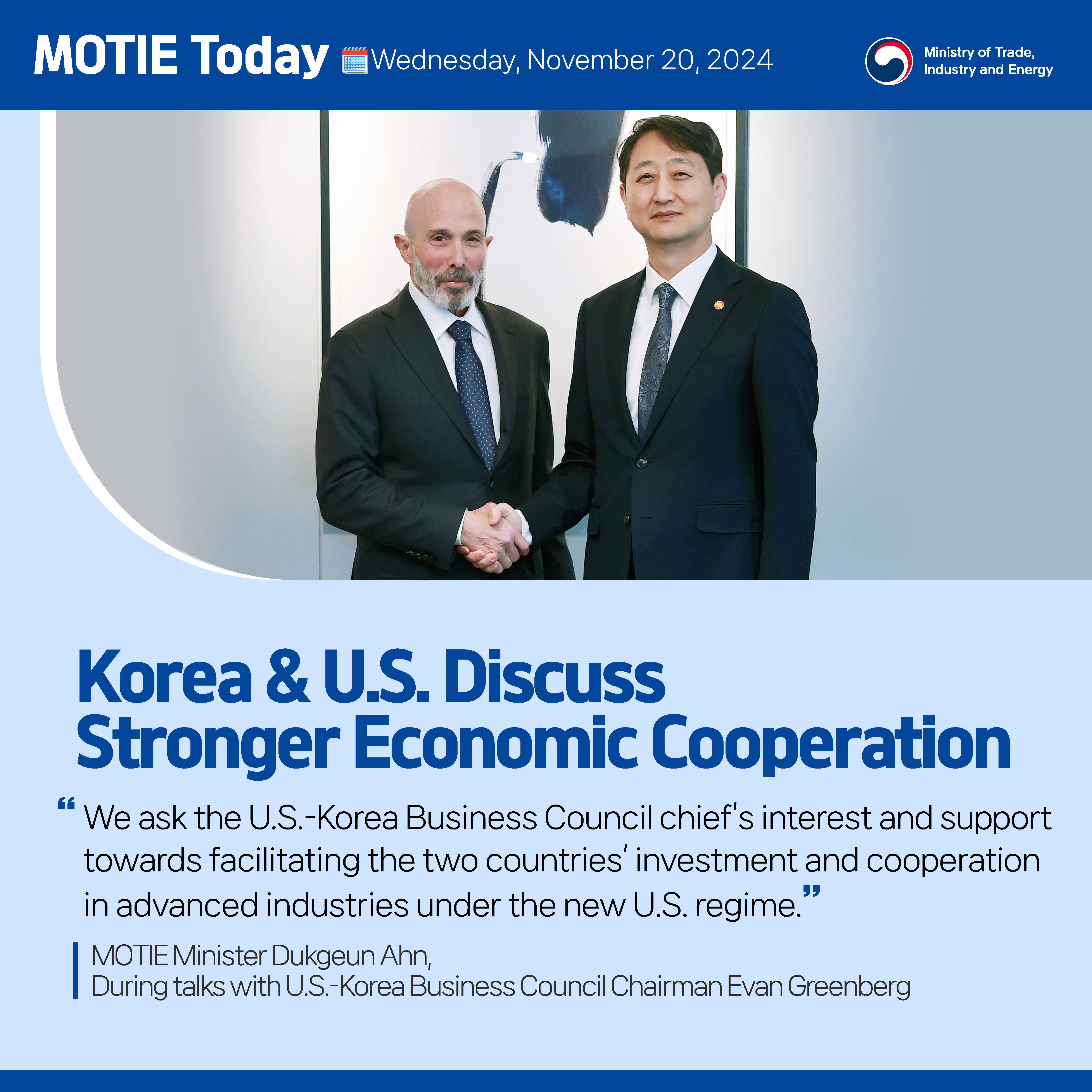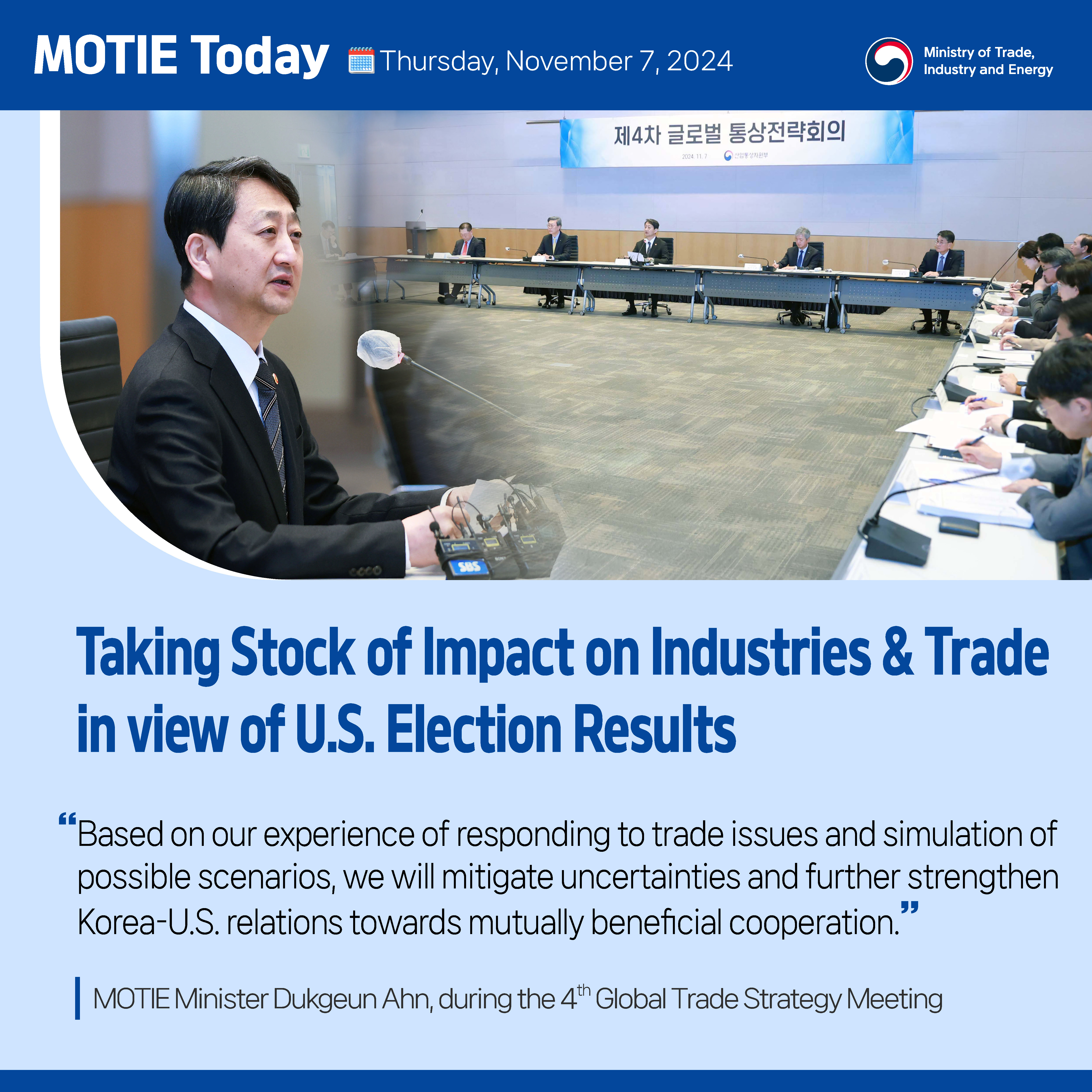 Korea & U.S. discuss stronger economic cooperation date2024-11-27 hits232 View Details Trade Minister Cheong attends 35th AMM date2024-11-27 hits218 View Details Korea revving up design industry with AI date2024-11-27 hits184 View Details Korea and Peru ink critical minerals supply chain cooperation MOU date2024-11-25 hits188 View Details Korea's auto industry sees triple growth in October date2024-11-25 hits127 View Details Korea's ICT exports hit all-time highs for October date2024-11-25 hits156 View Details 4th Global Trade Strategy Meeting date2024-11-18 hits213 View Details Korea Sale FESTA 2024 to jumpstart domestic economy date2024-11-18 hits167 View Details All 14 noncapital regions designated as ODZs date2024-11-15 hits200 View Details first pageprev page678910next pagelast page