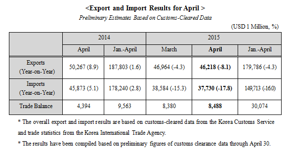 South Korea and India Upgrade Bilateral Relations to `Special Strategic Parnership' date2015-05-19 View Details South Korea and Japan's Business Leaders Support Trilateral FTA with China date2015-05-18 View Details South Korea and Romania to Strengthen Industrial Cooperation date2015-05-15 View Details South Korea, China and Japan Hold 7th Round of FTA Talks in Seoul date2015-05-13 View Details MOTIE Discusses Economic Cooperation with India date2015-05-11 View Details South Korea and Vietnam Officially Sign Free Trade Agreement date2015-05-07 View Details South Korea Posts Record Trade Surplus for 3rd Staight Month in April date2015-05-07 View Details President Park Geun-hye Returns Home After Four-Nation Tour of Latin America date2015-04-27 View Details South Korea and Brazil to Seek Bilateral Cooperation date2015-04-24 View Details first pageprev page231232233234235next pagelast page